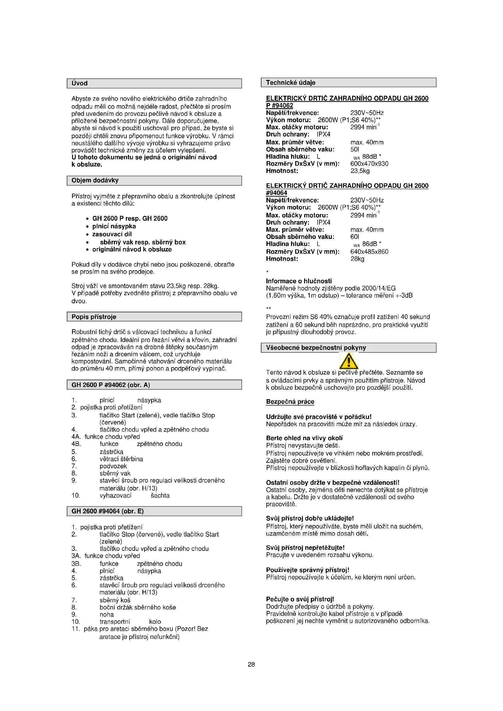 - originální návod k obsluze Pokud díly v dodávce chybí nebo jsou poškozené, obraťte se prosím na svého prodejce. Stroj váží ve smontovaném stavu 23,5kg resp. 28kg. V případě potřeby zvedněte přístroj z přepravního obalu ve dvou. Popis přístroje Robustní tichý drtič s válcovací technikou a funkcí zpětného chodu. Ideální pro řezání větví a křovin, zahradní odpad je zpracováván na drobné štěpky současným řezáním noži a drcením válcem, což urychluje kompostování. Samočinné vtahování drceného materiálu do průměru 40 mm, přímý pohon a podpěťový vypínač. GH 2600 P #94062 (obr. A)