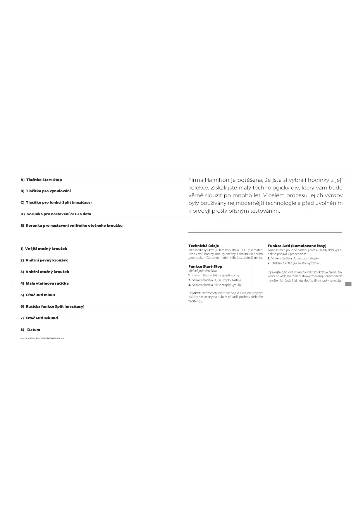 kroužku (1) naproti červené šipce = 17,5 mph. Nastavení časové zóny a data Když vytáhnete korunku (D) do její mezipolohy (1), lze nastavovat hodinovou ručičku vpřed i vzad bez ovlivnění nastavení minutové a vteřinové ručičky. Oprava data se provádí vždy, když hodinová ručička přechází číslici 12 o půlnoci. Důležité: Korunky (D) a (E) jsou šroubovací, aby se tak zabezpečila optimální vodotěsnost. Chceme-li se dostat k jejich příslušným funkcím, je třeba je odšroubovat. Ujistěte se, aby po libovolných operacích, kdy se korunky použí- vají, byly korunky znovu zašroubovány. Nastavení času Když je korunka (D) v poloze (2), zastaví se všechny ručičky hodinek – včetně vteřinové ručičky – a ručičky hodinové i minutové lze nastavit dle přání. Úprava nastavení stopek (Nejsou-li ručičky přesně na nule.) Když se ručky stopek pohybují stiskněte tlačítko (A) a zastavte stopky, potom stiskněte tlačítko (B): ručičky se vrátí do výchozích poloh. Pokud by se ručičky nevrátily přesně na nulu, lze každou z nich nastavit na nulu násle- dujícím způsobem: Čítač 30ti minut S korunkou (D) v poloze 1: stiskněte tlačítko (A) Čítač 60ti sekund (bílá ručička – ručička na zlomky vteřin) S korunkou (D) v poloze 2: stiskněte tlačítko (A) Čítač 60ti sekund (červená ručička – ručička na zlomky vteřin) S korunkou (D) v poloze 2: stiskněte tlačítko (B) Poznámka: Ručičky lze posunout vpřed rychleji, přidržíte- li tlačítko ve stisknuté poloze déle než vteřinu. Důležité: Neponechávejte korunku v poloze 1 déle než 20 minut, neboť by to mohlo vést k narušení časoměrné funkce.74 © 24.06.2013 – HAMILTON INSTRUCTION MANUAL 7576 © 24.06.2013 – HAMILTON INSTRUCTION MANUAL 7778 © 24.06.2013 – HAMILTON INSTRUCTION MANUAL 7980 © 24.06.2013 – HAMILTON INSTRUCTION MANUAL 8182 © 24.06.2013 – HAMILTON INSTRUCTION MANUAL 8384 © 24.06.2013 – HAMILTON INSTRUCTION MANUAL 8586 © 24.06.2013 – HAMILTON INSTRUCTION MANUAL 8788 © 24.06.2013 – HAMILTON INSTRUCTION MANUAL 8990 © 24.06.2013 – HAMILTON INSTRUCTION MANUAL 9192 © 24.06.2013 – HAMILTON INSTRUCTION MANUAL 9394 © 24.06.2013 – HAMILTON INSTRUCTION MANUAL 9596 © 24.06.2013 – HAMILTON INSTRUCTION MANUAL 9798 © 24.06.2013 – HAMILTON INSTRUCTION MANUAL 99100 © 24.06.2013 – HAMILTON INSTRUCTION MANUAL 101102 © 24.06.2013 – HAMILTON INSTRUCTION MANUAL 103104 © 24.06.2013 – HAMILTON