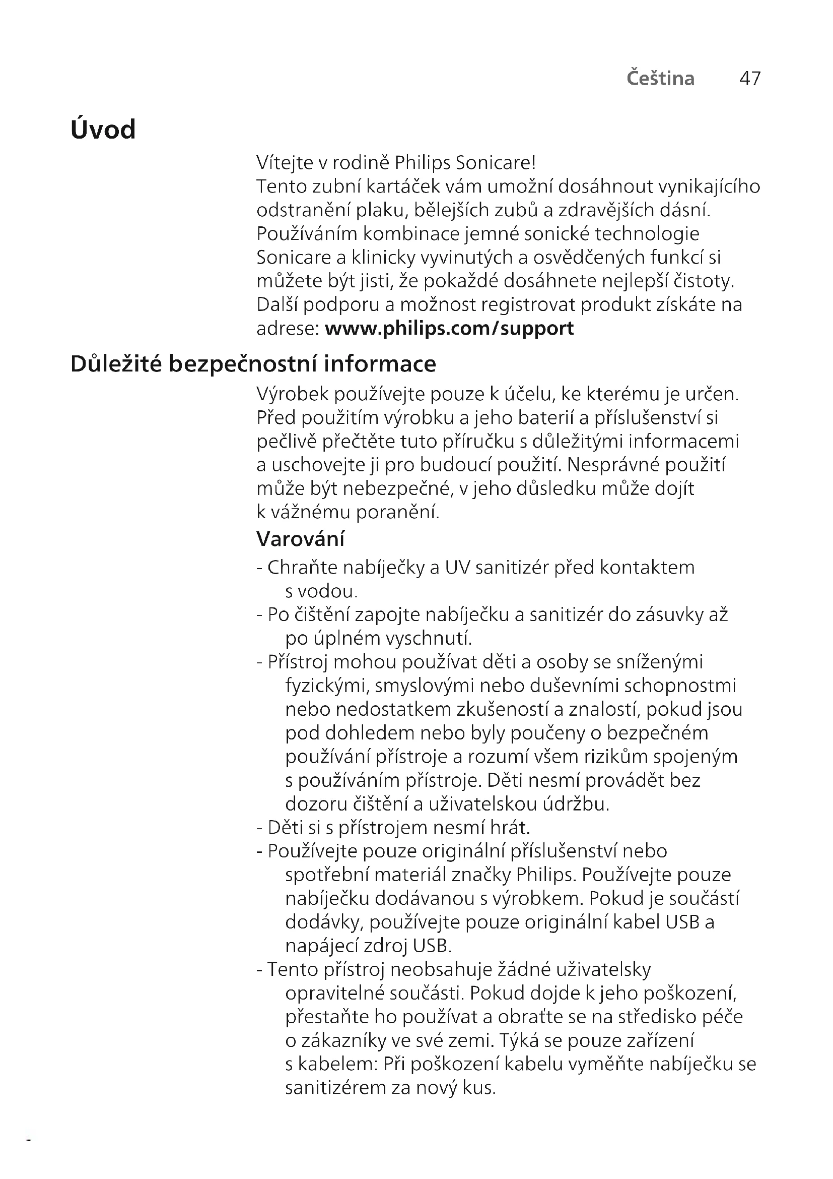 Čeština Úvod Vítejte vrodině Philips Sonicare! Tento zubní kartáček vám umožní dosáhnout vynikajícího odstranění plaku, bělejších zubů azdravějších dásní. Používáním kombinace jemné sonické technologie Sonicare aklinicky vyvinutých aosvědčených funkcí si můžete být jisti, že pokaždé dosáhnete nejlepší čistoty. Další podporu amožnost registrovat produkt získáte na adrese: www.philips.com/support Důležité bezpečnostní informace Výrobek používejte pouze kúčelu, ke kterému je určen. Před použitím výrobku ajeho baterií apříslušenství si pečlivě přečtěte tuto příručku sdůležitými informacemi auschovejte ji pro budoucí použití. Nesprávné použití může být nebezpečné, vjeho důsledku může dojít kvážnému poranění. Varování - Chraňte nabíječky a UV sanitizér před kontaktem svodou. - Po čištění zapojte nabíječku a sanitizér dozásuvky až po úplném vyschnutí. - Přístroj mohou používat děti a osoby se sníženými fyzickými, smyslovými nebo duševními schopnostmi nebo nedostatkem zkušeností a znalostí, pokud jsou pod dohledem nebo byly poučeny obezpečném používání přístroje a rozumí všem rizikům spojeným spoužíváním přístroje. Děti nesmí provádět bez dozoru čištění auživatelskou údržbu. - Děti si spřístrojem nesmí hrát. - Používejte pouze originální příslušenství nebo spotřební materiál značky Philips. Používejte pouze nabíječku dodávanou svýrobkem. Pokud je součástí dodávky, používejte pouze originální kabel USB a napájecí zdroj USB. - Tento přístroj neobsahuje žádné uživatelsky opravitelné součásti. Pokud dojde kjeho poškození, přestaňte ho používat a obraťte se na středisko péče ozákazníky ve své zemi. Týká se pouze zařízení skabelem: Při poškození kabelu vyměňte nabíječku se sanitizérem za nový kus.48 Čeština - Nepoužívejte nabíječku asanitizér ve venkovním prostoru ani blízko horkých povrchů. - Žádné díly výrobku nemyjte vmyčce nádobí. - Tento přístroj je určen pouze kčištění zubů, dásní ajazyka. - Sanitizér vždy udržujte mimo dosah dětí. - Pokud UV výbojka svítí ipři otevřených dvířkách, ukončete používání sanitizér. UV záření může poškodit lidský zrak a pokožku. - Sanitizér používejte pouze s nasazenou ochrannou clonou. - Nedotýkejte se horké UV žárovky UV sanitizéru. - Jsou-li vlákna na hlavici kartáčku poškozená nebo ohnutá, přestaňte hlavici používat. Hlavici kartáčku měňte každé 3měsíce nebo – pokud se objeví známky opotřebení – ičastěji. - Produkt nesmí přijít do přímého kontaktu sprodukty, které obsahují esenciální oleje nebo kokosový olej. Kontakt může způsobit uvolnění vláken. - Přestaňte přístroj používat a poraďte se se svým zubním lékařem / lékařem, pokud po použití dojde k nadměrnému krvácení, pokud krvácení přetrvá i po jednom týdnu používání nebo pokud zaznamenáte nepříjemné pocity nebo bolest. - Pokud jste vposledních 2měsících podstoupili operaci zubu či dásní, poraďte se před použitím přístroje se svým zubním lékařem. - Pokud máte kardiostimulátor nebo jiné implantované zařízení, poraďte se slékařem nebo svýrobcem implantovaného zařízení, než přístroj použijete. - Máte-li zdravotní pochybnosti, obraťte se před použitím přístroje na svého lékaře. - Tento přístroj je určen kosobní péči, nikoli províce pacientů ve stomatologické ordinaci nebo instituci. Bezpečnostní pokyny týkající se baterií - Tento přístroj obsahuje baterie, jejichž výměnu smí provádět pouze kvalifikovaná osoba.49 Čeština - Výrobek používejte pouze kúčelu, ke kterému je určen. Před použitím výrobku ajeho baterií apříslušenství si pečlivě přečtěte tuto příručku sinformacemi auschovejte ji pro budoucí použití. Nesprávné použití může být nebezpečné, vjeho důsledku může dojít kvážnému poranění. Dodané příslušenství se může pro různé výrobky lišit. - Používejte pouze originální příslušenství aspotřební materiál značky Philips. Používejte pouze odnímatelnou napájecí jednotku TCBxxxx, HX6100, HX6110, HX6160 nebo WAAxxxx. - Výrobek abaterie uchovávejte mimo dosah ohně anevystavujte je přímému slunečnímu záření ani vysokým teplotám. - Pokud se výrobek nenormálně zahřeje, vydává zápach, změní barvu nebo pokud nabíjení trvá mnohem déle než obvykle, přestaňte výrobek používat nebo nabíjet aobraťte se na společnost Philips. - Nedávejte výrobky ani jejich baterie do mikrovlnné trouby ani na indukční sporáky. - Výrobek ani baterie nesmíte otevírat, upravovat, propíchnout, poškodit ani demontovat. Mohli byste tak způsobit přehřívání baterií nebo uvolnění toxických či nebezpečných látek. Baterie nezkratujte; dobíjecí baterie nenabíjejte přes limit ani je nenabíjejte vobrácené polaritě. - Přístroj obsahuje baterie, které nejsou určeny kvýměně. Když dosáhne baterie konce své životnosti, je nutné zařízení řádně zlikvidovat, viz část týkající se recyklace. - Pokud jsou baterie poškozené nebo znich uniká jakákoli látka, vyhněte se kontaktu takové baterie skůží nebo očima. Pokud by kněčemu takovému došlo, příslušné místo oplachujte vodou avyhledejte lékařskou pomoc. - Při manipulaci sbateriemi se ujistěte, že máte suché ruce aže výrobek ibaterie jsou suché.50 Čeština - Zabraňte nezáměrnému zkratování baterií po jejich vyjmutí zvýrobku: nedovolte, aby se póly baterie dostaly do kontaktu skovovými předměty (mince, sponky, prsteny). Nebalte baterie do hliníkové fólie. Před likvidací póly baterií přelepte páskou nebo je umístěte do plastového sáčku. - Výrobek nabíjejte, používej