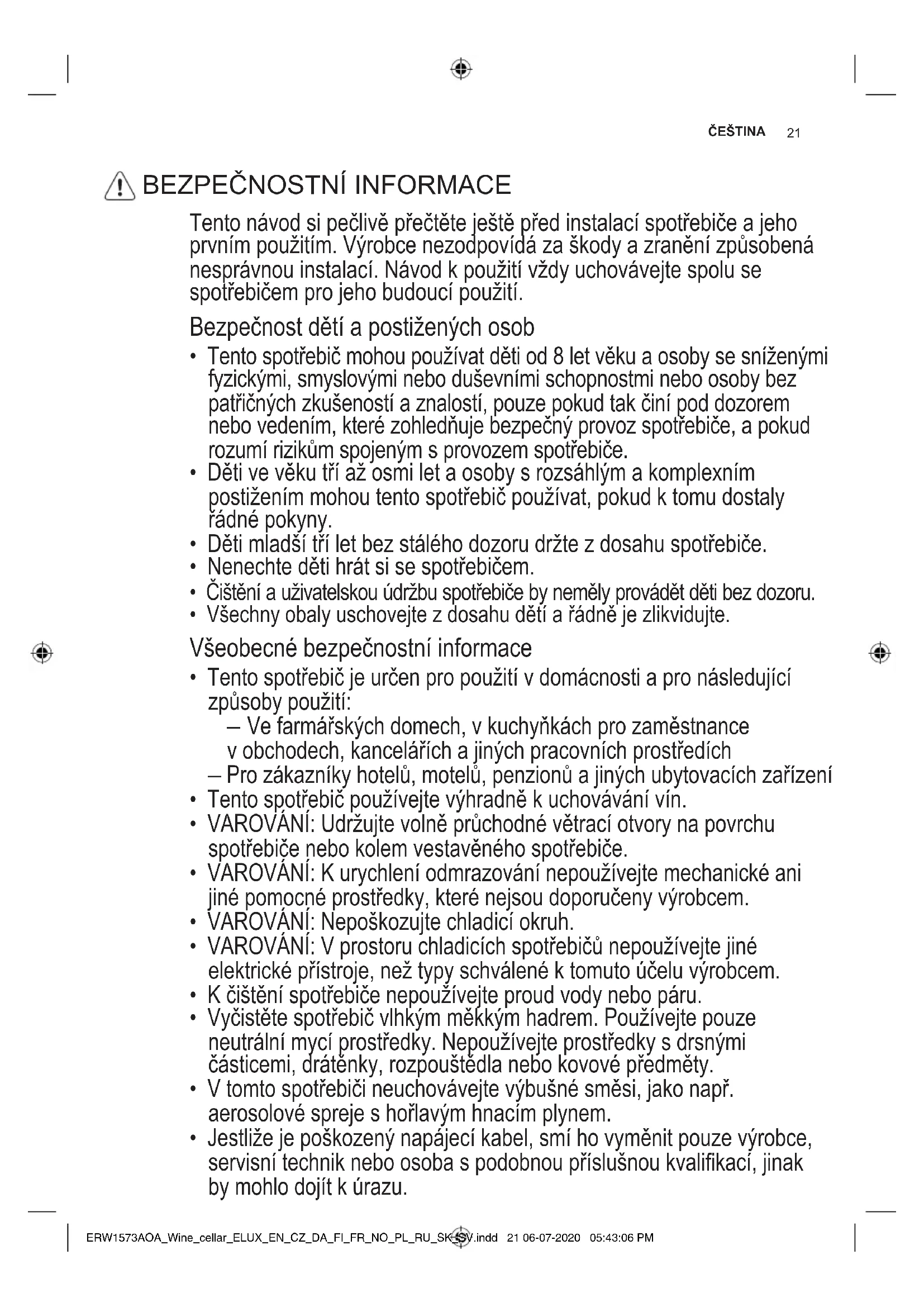 - Neotvírejtečastodveře,anije nenechávejteotevřenédéle,nežje nezbytněnutné TIPYARADY ERW1573AOA_Wine_cellar_ELUX_EN_CZ_DA_FI_FR_NO_PL_RU_SK_SV.indd 27 06-07-2020 05:43:07 PM28 www.electrolux.com INSTALACE VAROVÁNÍ! Vizkapitolyobezpečnosti. Umístění Abystezajistilinejlepšífunkcispotřebiče, nemělibystejejinstalovatvblízkosti zdrojůtepla(trouby,sporáků,radiátorů nebovarnýchdesek)nebonamístěs přímýmslunečnímsvitem.Dbejtenato, abykolemzadnístěnyskříněspotřebiče mohlvolněprouditvzduch. Tentospotřebičbymělbýtinstalovánna suchém,dobřevětranémmístěvnitřních prostor. Tentospotřebičjeurčenkpoužívánípři okolníteplotěod16°Cdo38°C. Správnýprovozspotřebičelze zaručitpouzevrámcistanoveného teplotníhorozsahu. Pokudmátejakékolivpochy- byohledněmístainstalace spotřebiče,obraťtesenaprodejce, nanášzákaznickýservisnebo nanejbližšíautorizovanéservisní středisko. Spotřebičmusíbýtmožnéodpojit odelektrickésítě.Zástrčkamusí protobýtipoinstalacidobře přístupná. Umístění Okolospotřebičemusíbýtdostatečná cirkulacevzduchu,abysezabránilojeho přehřívání.Kdosaženídostatečného větráníseřiďtepokynykinstalaci. Spotřebičinstalujtenamístě,jehož okolníteplotaodpovídáklimatickétřídě uvedenénatypovémštítkuspotřebiče: Tentospotřebičjeurčenkpoužívánípři okolníteplotěod16°Cdo38°C. Připojeníkelektrickésíti POZOR! Jakékolielektrikářsképráce,nutné prozapojenítohotospotřebiče, smíprovádětpouzekvalikovaný elektrikářneboosobas příslušnýmoprávněním. VAROVÁNÍ! Tentospotřebičmusíbýt uzemněn.Výrobceodmítá jakoukoliodpovědnostvpřípadě, ženebyladodrženatato bezpečnostníopatření. Pokudvámnejsoupokynyohledně uzemněníspotřebičezcelajasnénebo pokudmátepochybyotom,zdaje spotřebičřádněuzemněný,obraťte senakvalikovanéhoelektrikářenebo servisníhotechnika. Spotřebičsmíbýtpřipojenksítiažpo ověření,ženapětíafrekvenceuvedené natypovémštítkuodpovídajínapětív domácísíti. VAROVÁNÍ! Předzapojenímainstalací spotřebičedoporučujemevyčkat čtyřihodiny,abymohlochladivo natéctzpětdokompresoru. Tentospotřebičmusíbýtuzemněn. Zástrčkanapájecíhokabelujektomuto účeluvybavenapříslušnýmkontaktem. Pokudnenídomácísíťovázásuvka uzemněná,připojtespotřebičk samostatnémuuzemněnívsouladu splatnýmipředpisy. Obraťtesenakvalikovanéhoelektrikáře. ERW1573AOA_Wine_cellar_ELUX_EN_CZ_DA_FI_FR_NO_PL_RU_SK_SV.indd 28 06-07-2020 05:43:07 PMČEŠTINA
