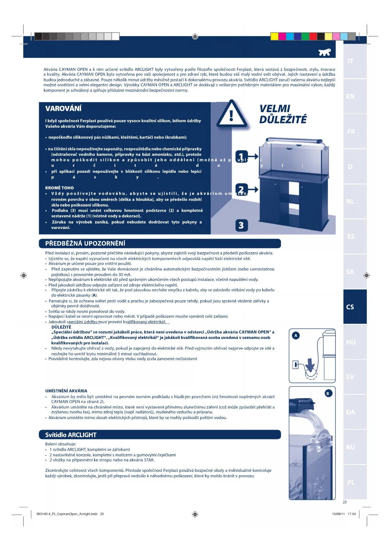 Společnost Ferplast zaručuje, že akvária CAYMAN OPEN svitidlo ARCLIGHT a všechny komponenty a příslušenství splůují úbdpíníků následujícího paragrafu a aktuálních právních ustanovení. Záruka se vztahuje jen na výrobní nedostatky a zahrnuje opravu anebo výměnu. Záruka se anuluje v následujících připadech: poškození a/nebo závady způsobení nedbalosti, opotřebováním, použitím v rozporu s informacemi a výstrahami uvedenými v aktuální brožuře, nehodou, nedovolenou manipulací, nesprávním použitím, nesprávnými opravami, chybějící doklad o koupí. Zářivky, startér (pokud je v příslušenství), houby a filtrovaci materiál všeobecně nejsou kryté zárukou.