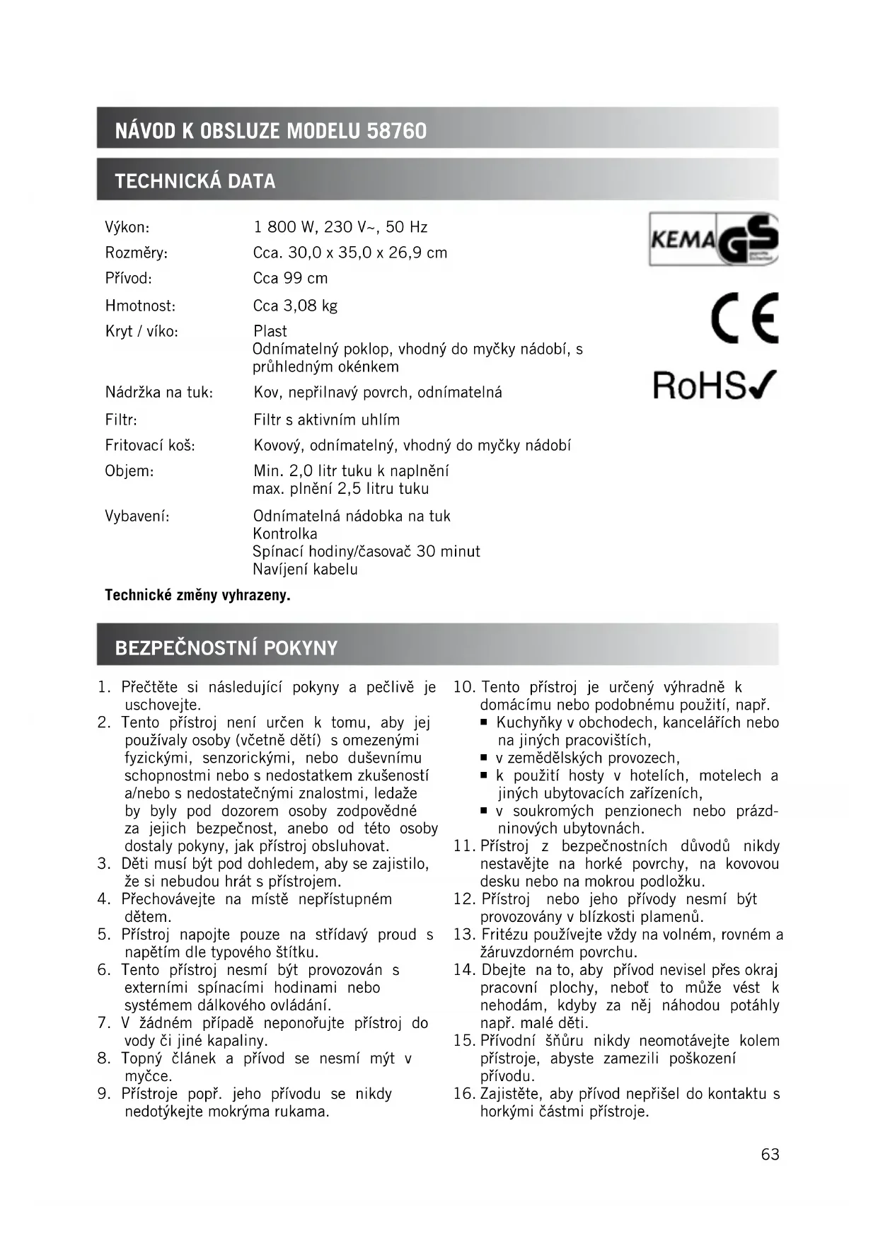 horkými částmi přístroje. Výkon: 1 800 W, 230 V~, 50 Hz Rozměry: Cca. 30,0 x 35,0 x 26,9 cm Přívod: Cca 99 cm Hmotnost: Cca 3,08 kg Kryt / víko: Plast Odnímatelný poklop, vhodný do myčky nádobí, s průhledným okénkem Nádržka na tuk: Kov, nepřilnavý povrch, odnímatelná Filtr: Filtr s aktivním uhlím Fritovací koš: Kovový, odnímatelný, vhodný do myčky nádobí Objem: Min. 2,0 litr tuku k naplnění max. plnění 2,5 litru tuku Vybavení: Odnímatelná nádobka na tuk Kontrolka Spínací hodiny/časovač 30 minut Navíjení kabelu Technické změny vyhrazeny.64 Bezpečnostní upozornění týkající se fritování