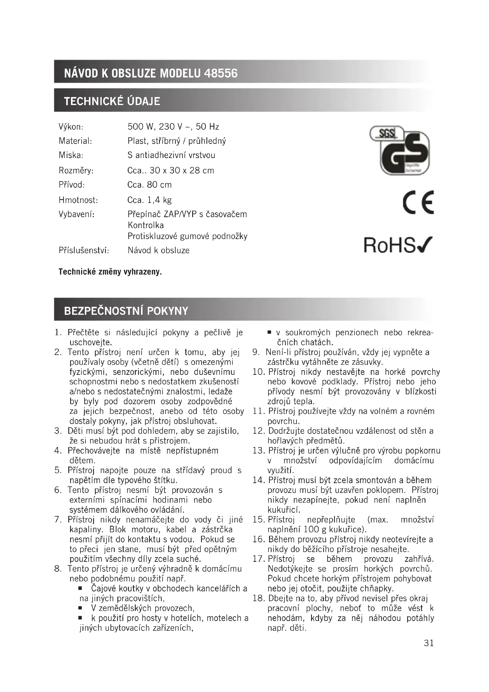 pracovní plochy, neboť to může vést k nehodám, kdyby za něj náhodou potáhly např. děti. Výkon: 500 W, 230 V ~, 50 Hz Material: Plast, stříbrný / průhledný Miska: S antiadhezivní vrstvou Rozměry: Cca.. 30 x 30 x 28 cm Přívod: Cca. 80 cm Hmotnost: Cca. 1,4 kg Vybavení: Přepínač ZAP/VYP s časovačem Kontrolka Protiskluzové gumové podnožky Příslušenství: Návod k obsluze Technické změny vyhrazeny.32