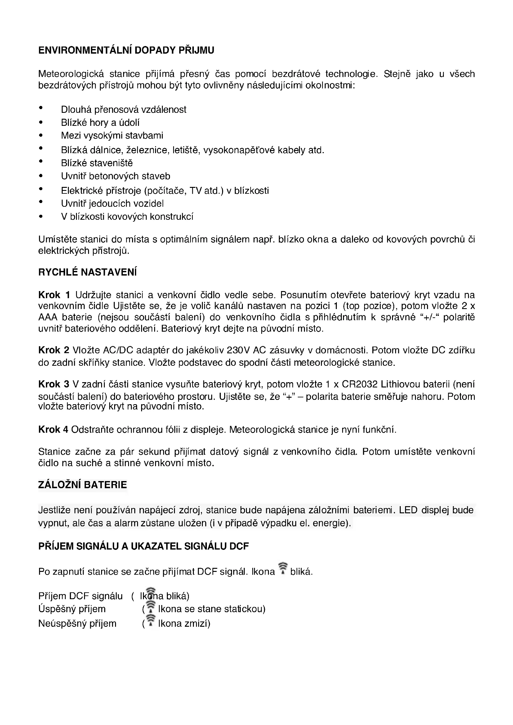 ŘÍJEM SIGNÁLU A UKAZATEL SIGNÁLU DCF Po zapnutí stanice se začne přijímat DCF signál. Ikona bliká. Příjem DCF signálu ( Ikona bliká) Úspěšný příjem ( Ikona se stane statickou) Neúspěšný příjem ( Ikona zmizí)Během příjmu prosím stiskněte tlačítko / WAVE zobrazí se režim přijmu a síla signálu označení: Když je zjištěn silný signál DCF, displej ukazuje 3 čárky . Když je slabý signál DCF, nebo není žádný, displej ukazuje nebo . Během příjmu se síla signálu může pohybovat od 1 do 2 čárek až do 3 čárek. To je normální protože hodiny zjišťují DCF signál a další signály ve vzduchu současně. Stiskněte tlačítko SET a vrátíte se do zobrazení času s blikající ikonou. Úspěšný příjem nebo neúspěšný příjem Ikona se stane statickou (přestane blikat) když dojde k úspěšnému příjmu. Když selže příjem, tak ikona zmizí. Automatický příjem a manuální příjem Stanice začne automaticky přijímat signál každý den v 1:00, 2:00, a 3:00. Pokud se nepodař í příjem signálu DCF ve 3:00 hodiny, začne příjem ve 4:00 hodiny. Pokud se opět nepodaří příjem signálu, začne signál přijímat opět v 5:00 hodin. Pokud příjem opět selže, začne opět automatický příjem v 1:00 příštího dne. Pro ruční nastavení jednoduše stiskněte a držte / WAVE tlačítko,stanice krátce zapípá a začne ruční příjem. Pro zastavení příjmu DCF signálu stiskněte a držte / WAVE tlačítko. Jestliže Meteorologická stanice přijímá rádiem řízený časový signál její displej potemní. Po ukončení příjmu časového signálu dojde k obnovení úrovně jasu, kterou jste předtím nastavili. Během příjmu DCF signálu nefunguje žádné tlačítko a stanice neprovádí měření teploty. Údaje o teplotě se stabilizují a zpřesní až poté, co jsou hodiny napájeny alespoň po 30 minut. Trvalé zrušení příjmu DCF signálu Stlačte a držte / WAVE a tlačítkosoučasně na 2 sekundy, stanice dvakrát krátce zapípá a rádiově řízená funkce bude trvale vypnutá. Pro obnovení funkce rádiově řízeného signálu, stlačte a držte / WAVE a tlačítko současně na 2 sekundy, stanice 2 krát krátce zapípá a okamžitě začne příjem DCF signálu.