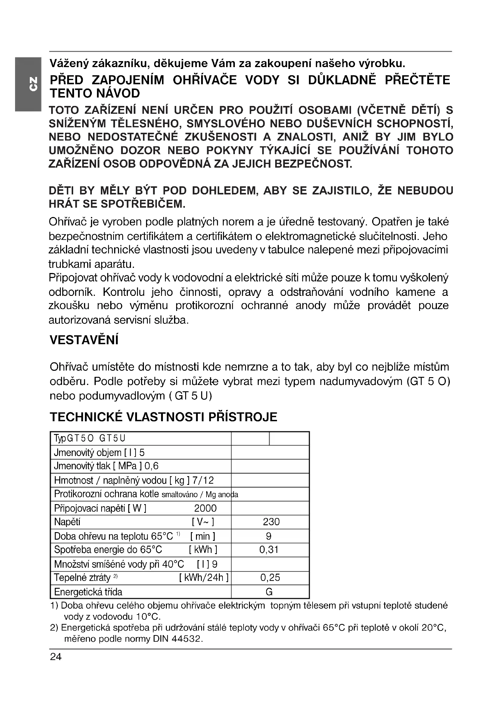 Ohřívač je vyroben podle platných norem a je úředně testovaný. Opatřen je také bezpečnostním certifikátem a certifikátem o elektromagnetické slučitelnosti. Jeho základní technické vlastnosti jsou uvedeny v tabulce nalepené mezi připojovacími trubkami aparátu. Připojovat ohřívač vody k vodovodní a elektrické síti může pouze k tomu vyškolený odborník. Kontrolu jeho činnosti, opravy a odstraňování vodního kamene a zkoušku nebo výměnu protikorozní ochranné anody může provádět pouze autorizovaná servisní služba. VESTAVĚNÍ Ohřívač umístěte do místnosti kde nemrzne a to tak, aby byl co nejblíže místům