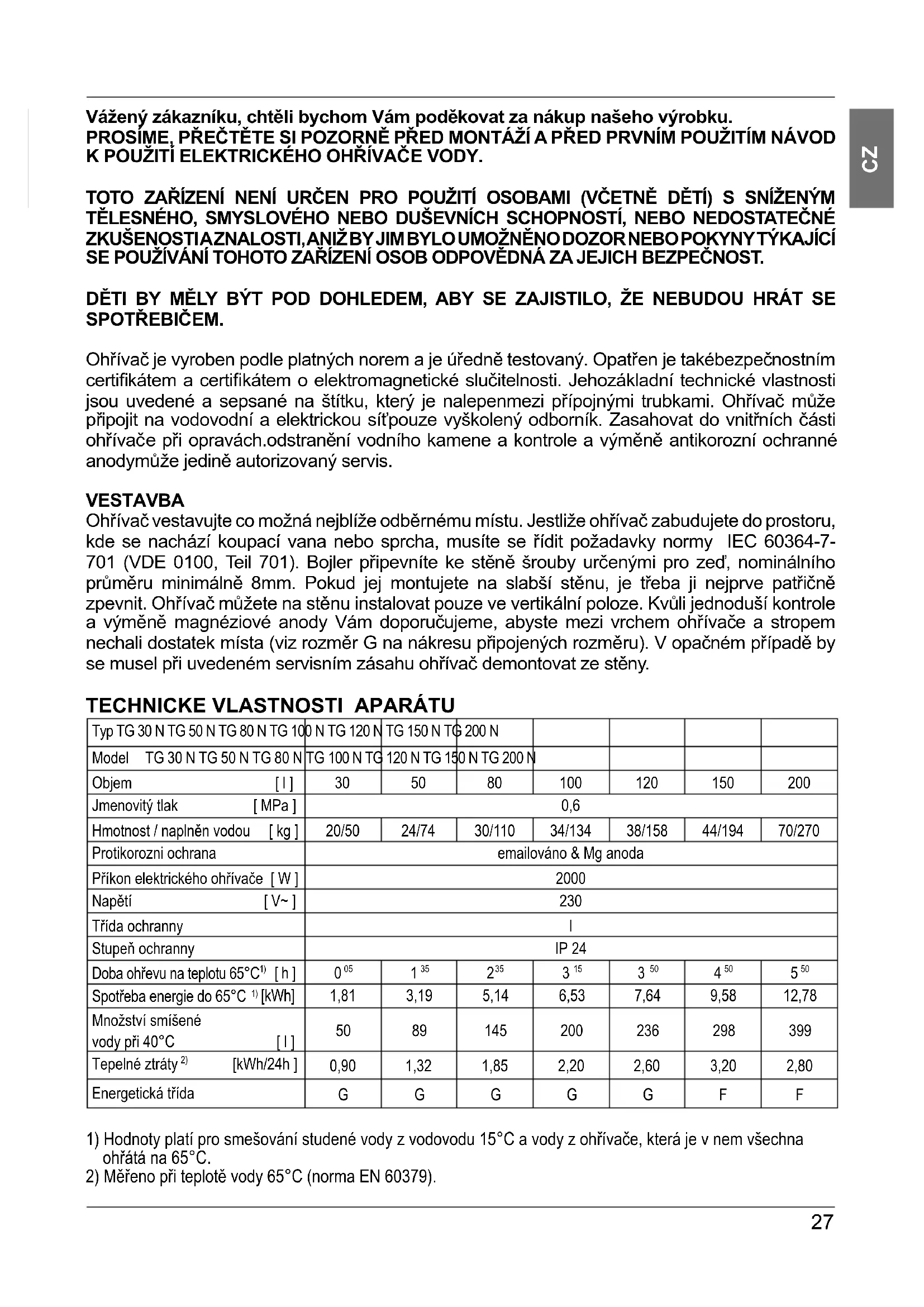 Vážený zákazníku, chtěli bychom Vám poděkovat za nákup našeho výrobku. PROSÍME, PŘEČTĚTE SI POZORNĚ PŘED MONTÁŽÍ A PŘED PRVNÍM POUŽITÍM NÁVOD K POUŽITÍ ELEKTRICKÉHO OHŘÍVAČE VODY. TOTO ZAŘÍZENÍ NENÍ URČEN PRO POUŽITÍ OSOBAMI (VČETNĚ DĚTÍ) S SNÍŽENÝM TĚLESNÉHO, SMYSLOVÉHO NEBO DUŠEVNÍCH SCHOPNOSTÍ, NEBO NEDOSTATEČNÉ ZKUŠENOSTI A ZNALOSTI, ANIŽ BY JIM BYLO UMOŽNĚNO DOZOR NEBO POKYNY TÝKAJÍCÍ SE POUŽÍVÁNÍ TOHOTO ZAŘÍZENÍ OSOB ODPOVĚDNÁ ZA JEJICH BEZPEČNOST. DĚTI BY MĚLY BÝT POD DOHLEDEM, ABY SE ZAJISTILO, ŽE NEBUDOU HRÁT SE SPOTŘEBIČEM. Ohřívač je vyroben podle platných norem a je úředně testovaný. Opatřen je takébezpečnostním certifi kátem a certifi kátem o elektromagnetické slučitelnosti. Jehozákladní technické vlastnosti jsou uvedené a sepsané na štítku, který je nalepenmezi přípojnými trubkami. Ohřívač může připojit na vodovodní a elektrickou síťpouze vyškolený odborník. Zasahovat do vnitřních části ohřívač e při opravách.odstranění vodního kamene a kontrole a výměně antikorozní ochranné anodymůže jedině autorizovaný servis. VESTAVBA Ohřívač vestavujte co možná nejblíže odběrnému místu. Jestliže ohřívač zabudujete do prostoru, kde se nachází koupací vana nebo sprcha, musíte se řídit požadavky normy IEC 60364-7- 701 (VDE 0100, Teil 701). Bojler připevníte ke stěně šrouby určenými pro zeď, nominálního průměru minimálně 8mm. Pokud jej montujete na slabší stěnu, je třeba ji nejprve patřičně zpevnit. Ohřívač můžete na stěnu instalovat pouze ve vertikální poloze. Kvůli jednoduší kontrole a výměně magnéziové anody Vám doporučujeme, abyste mezi vrchem ohřívače a stropem nechali dostatek místa (viz rozměr G na nákresu připojených rozměru). V opačném případě by se musel při uvedeném servisním zásahu ohřívač demontovat ze stěny.