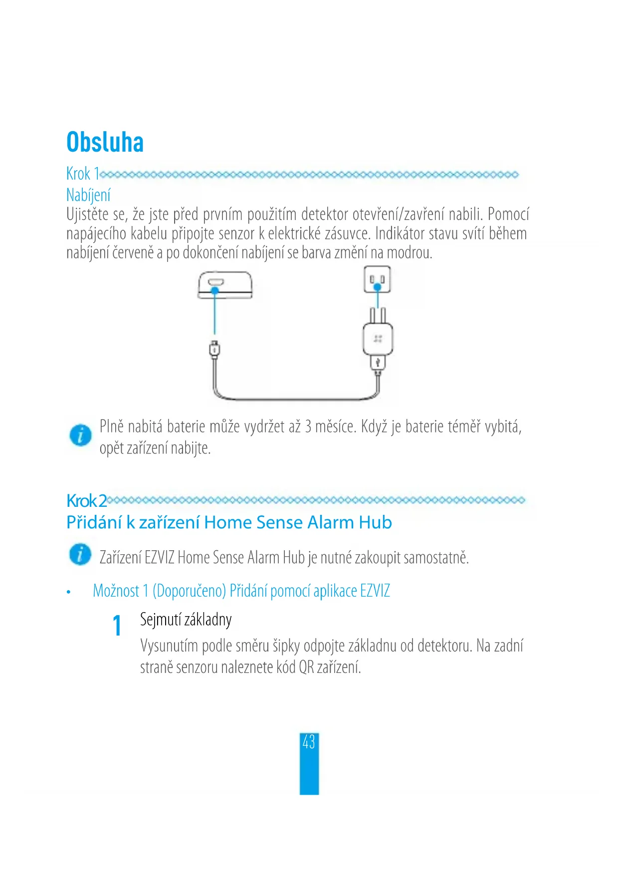 Όταν η μπαταρία εξαντλείται, αποστέλλεται ειδοποίηση χαμηλής μπαταρίας στον λογαριασμό EZVIZ, ειδοποιώντας σας να την επαναφορτίσετε. Αφαιρέστε τον ανιχνευτή από τη βάση του για να τον επαναφορτίσετε. Τοποθετήστε τον ξανά μόνο αφού ολοκληρωθεί η επαναφόρτιση.43 Obsluha Krok1 Nabíjení Ujistěte se, že jste před prvním použitím detektor otevření/zavření nabili. Pomocí napájecího kabelu připojte senzor kelektrické zásuvce. Indikátor stavu svítí během nabíjení červeně apo dokončení nabíjení se barva změní na modrou. Plně nabitá baterie může vydržet až 3měsíce. Když je baterie téměř vybitá, opět zařízení nabijte. Krok2 Přidání kzařízení Home Sense Alarm Hub Zařízení EZVIZ Home Sense Alarm Hub je nutné zakoupit samostatně.