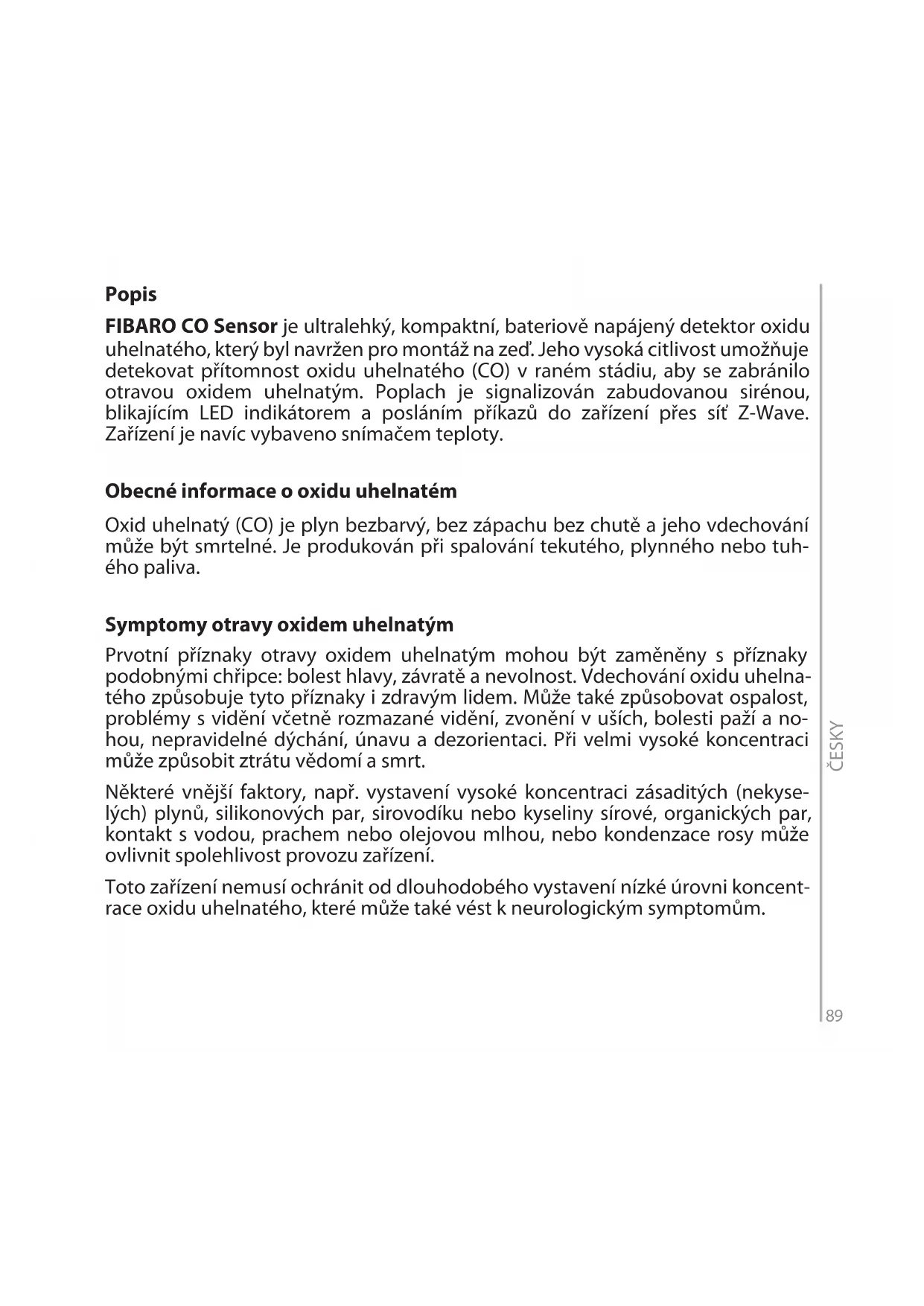 Produsenten er ikke ansvarlig for indirekte, tilfeldige, spesielle, følgeskader eller moralske tap, eller skader, inkludert men ikke begrenset til tapt fortjeneste, sparepenger, data, tap av fordeler, krav fra tredjeparter eller andre skader som oppstår som følge av eller i forbindelse med bruk av Enheten.89 Popis FIBARO CO Sensor je ultralehký, kompaktní, bateriově napájený detektor oxidu uhelnatého, který byl navržen pro montáž na zeď. Jeho vysoká citlivost umožňuje detekovat přítomnost oxidu uhelnatého (CO) v raném stádiu, aby se zabránilo otravou oxidem uhelnatým. Poplach je signalizován zabudovanou sirénou, blikajícím LED indikátorem a posláním příkazů do zařízení přes síť Z-Wave. Zařízení je navíc vybaveno snímačem teploty. Obecné informace o oxidu uhelnatém Oxid uhelnatý (CO) je plyn bezbarvý, bez zápachu bez chutě a jeho vdechování může být smrtelné. Je produkován při spalování tekutého, plynného nebo tuh- ého paliva. Symptomy otravy oxidem uhelnatým Prvotní příznaky otravy oxidem uhelnatým mohou být zaměněny s příznaky podobnými chřipce: bolest hlavy, závratě a nevolnost. Vdechování oxidu uhelna- tého způsobuje tyto příznaky i zdravým lidem. Může také způsobovat ospalost, problémy s vidění včetně rozmazané vidění, zvonění v uších, bolesti paží a no- hou, nepravidelné dýchání, únavu a dezorientaci. Při velmi vysoké koncentraci může způsobit ztrátu vědomí a smrt. Některé vnější faktory, např. vystavení vysoké koncentraci zásaditých (nekyse- lých) plynů, silikonových par, sirovodíku nebo kyseliny sírové, organických par, kontakt s vodou, prachem nebo olejovou mlhou, nebo kondenzace rosy může ovlivnit spolehlivost provozu zařízení. Toto zařízení nemusí ochránit od dlouhodobého vystavení nízké úrovni koncent- race oxidu uhelnatého, které může také vést k neurologickým symptomům. ČESKY90 Varování Nedodržení doporučení obsažených v této příručce může způsobit riziko pro ži- vot a zdraví nebo způsobit poruchu přístroje. Výrobce Fibar Group S.A. nebude zodpovědný za jakékoliv ztráty nebo škodu způsobenou nedodržením instrukcí v příručkách. Nebezpečí poruchy v důsledku manipulace se zařízením. Zařízení by mělo být připevněno pod úrovní stropu Zařízení by nemělo být umístěno: v koupelně, blízko zdrojů tepla, v dosahu dětí, tak aby bylo blokováno od zdrojů oxidu uhelnatého, na přímém slunečním světle. Zařízení není náhradou za vhodné ventilační nebo výfukové systémy. Nenatírejte zařízení barvou. Zařízení by mělo být čištěno mírně navlhčenou látkou nebo vlhčeným ubrouskem. Vyměňte zařízení před datem na boční straně nebo pokud je detekována chyba senzoru. Tento výrobek není hračka. Udržujte mimo dosah dětí a domácích zvířat! UPOZORNĚNÍ: V případě nahrazení baterie nesprávným typem může dojít k ex- plozi. Použité baterie likvidujte v souladu s pokyny. UPOZORNĚNÍ: Přístroje nemusí zabránit chronickým účinkům expozice oxidu uhelnatému. Přístroj plně nezabezpečí osoby vystavené zvláštnímu riziku. Funkce dálkového ztlumení alarmu by se měla používat pouze na dohled od zařízení. Pokud existuje jakákoli pochybnost o příčině poplachu, mělo by se předpokládat, že poplach je způsoben nebezpečnou hladinou oxidu uhelnatého, a obydlí by mělo být evakuováno. Místo instalace (strana 4) Připevněte zařízení na stěnu, alespoň 30 cm od rohu místnosti. Doporučená výška instalace je závislá na účelu místnosti a výšce, ve které je ob- vykle hlava. ČESKY91 Instalace (strana 6/7)