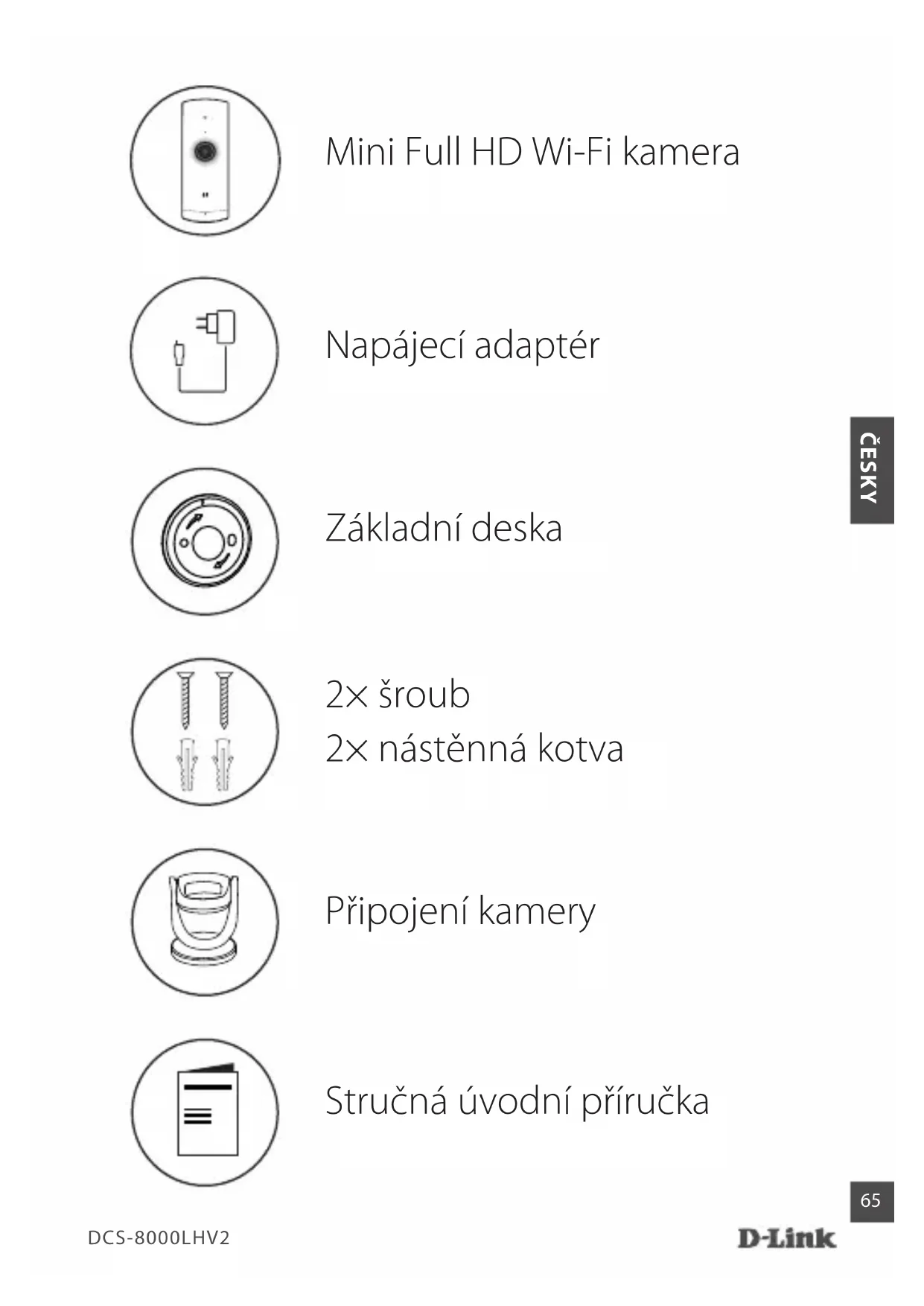 ČESK Y Stručná úvodní příručka Napájecí adaptér Mini Full HD Wi-Fi kamera 2× šroub 2× nástěnná kotva Připojení kamery Základní deskaDCS-8000LHV2 ČESK Y Vyhledejte klíčové slovo mydlink a stáhněte si aplikaci. Poznámka: Tento produkt není kompatibilní s ostatními aplikacemi mydlink, jako je mydlink Home, mydlink Lite atd. Stažení aplikace