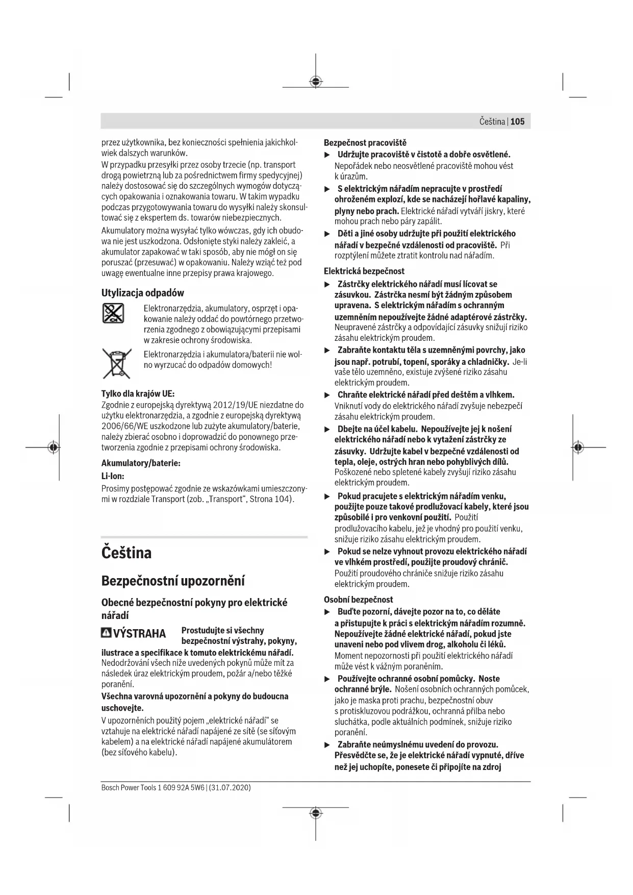 Úroveň vibrací aúroveň hluku, které jsou uvedené vtěchto pokynech, byly změřeny pomocí normované měřicí metody alze je použít pro vzájemné porovnání elektronářadí. Hodí se ipro předběžný odhad zatížení vibracemi ahlukem. Uvedená úroveň vibrací aúroveň hluku reprezentuje hlavní použití elektronářadí. Pokud se ovšem bude elektronářadí používat pro jiné práce, sjinými nástroji nebo snedostatečnou údržbou, může se úroveň hluku aúroveň vibrací lišit. To může zatížení vibracemi ahlukem po celou pracovní dobu zřetelně zvýšit. Pro přesný odhad zatížení vibracemi ahlukem by měly být zohledněny idoby, kdy je nářadí vypnuté nebo běží, ale ve skutečnosti se nepoužívá. To může zatížení vibracemi ahlukem po celou pracovní dobu výrazně snížit. Stanovte dodatečná bezpečnostní opatření kochraně obsluhy před účinky vibrací, jako je např. údržba elektronářadí anástrojů, udržování teplých rukou, organizace pracovních procesů. Montáž Nabíjení akumulátoru u Používejte pouze nabíječky uvedené vtechnických údajích. Jen tyto nabíječky jsou přizpůsobené pro 1 609 92A 5W6 | (31.07.2020) Bosch Power ToolsČeština | 109 lithium-iontový akumulátor používaný svaším elektronářadím. Upozornění: Akumulátor se dodává částečně nabitý. Aby byl zaručen plný výkon akumulátoru, před prvním použitím akumulátor úplně nabijte vnabíječce. Lithium-iontový akumulátor lze nabíjet kdykoli, aniž by se tím zkrátila životnost. Přerušení procesu nabíjení nepoškozuje akumulátor. Lithium-iontový akumulátor je díky „Electronic Cell Protection (ECP)“ chráněný proti hlubokému vybití. Při vybitém akumulátoru ochranná funkce vypne elektrické nářadí: Nástroj se již nepohybuje. u Po automatickém vypnutí elektronářadí už nestiskávejte vypínač. Akumulátor se může poškodit. Vyjmutí akumulátoru Pro vyjmutí akumulátoru stiskněte odjišťovací tlačítko akumulátoru aakumulátor vytáhněte směrem dozadu zelektrického nářadí. Nepoužívejte přitom násilí. Ukazatel stavu nabití akumulátoru Ukazatel stavu nabití akumulátoru (13) ukáže při napůl nebo úplně stisknutém vypínači (14) na několik sekund stav nabití akumulátoru askládá se ze tří zelených LED. LED Kapacita Trvale svítí 3 zelené ≥ 66% Trvale svítí 2 zelené 33 – 66% Trvale svítí 1 zelená 11 – 33% Pomalu bliká 1 zelená ≤ 10% Tři LED ukazatele stavu nabití blikají rychle, když je teplota akumulátoru mimo rozsah provozní teploty −30 až +65°C a/nebo zareagovala ochrana proti přetížení. Výměna nástroje Nasazení nástroje (viz obrázek A) Nasaďte nástroj až nadoraz do upínání nástroje (2). Nástroj drží vupínání nástroje pomocí magnetu. Vyjmutí nástroje Vytáhněte nástroj zupínání nástroje (2). Montáž nástavce (viz obrázek B) Vyjměte nástroj. Nasaďte nástavec do upínání nástroje (2). Nástavec slyšitelně zaskočí. Zkontrolujte řádné upevnění zatáhnutím za nástavec. Nasazení nástroje do nástavce (viz obrázek C) Nasaďte nástroj až nadoraz do nástavce. Nástroj drží vnástavci pomocí magnetu. Držák šroubu (viz obrázek D) Držák šroubu (16) stabilizuje šrouby tak, aby je bylo možné lépe nasadit na obrobek. Vyjměte nástroj. Nasaďte držáku šroubu na upínání nástroje (2) tak, aby slyšitelně zaskočil. Přitlačte magnetickou krytku (15) až nadoraz směrem kelektrickému nářadí. Poté nasaďte šroubovací bit (20) na držák šroubu (16) apřetáhněte magnetickou krytku dopředu přes šroubovací bit. Nasaďte šroub na šroubovací bit. Sklíčidlo (viz obrázek E) Povolte sklíčidlo (18) otáčením ve směru➊ tak, aby bylo možné nasadit nástroj. Nasaďte nástroj. Rukou silně utáhněte objímku sklíčidla (18) ve směru➋. Sklíčidlo se tím automaticky zajistí. Otočení nástavce (viz obrázek F) Vytáhněte odjišťovací kroužek (1) zelektrického nářadí apoté sejměte nástavec zupínání nástroje (2). Otočte nástavec do požadované polohy apak ho zase nasaďte. Zkontrolujte řádné upevnění zatáhnutím za nástavec. Demontáž nástavce (viz obrázek G) Vyjměte nástroj. Vytáhněte odjišťovací kroužek (1) zelektrického nářadí apoté stáhněte nástavec zupínání nástroje (2). Kombinace nástavců (viz obrázek H) Vyjměte nástroj. Nasaďte úhlový nástavec (17) na upínání nástroje (2). Zkontrolujte řádné upevnění zatáhnutím za úhlový nástavec (17). Nasaďte sklíčidlo (18) na úhlový nástavec (17). Zkontrolujte řádné upevnění zatáhnutím za sklíčidlo (18). Odsávání prachu/třísek Prach zmateriálů, jako jsou nátěry sobsahem olova, některé druhy dřeva, minerály akov, může být zdraví škodlivý. Kontakt sprachem či vdechnutí mohou vyvolat alergické reakce a/nebo onemocnění dýchacích cest obsluhy nebo vblízkosti se nacházejících osob. Určitý prach, jako dubový nebo bukový prach, je pokládán za karcinogenní, zvláště ve spojení spřídavnými látkami pro ošetření dřeva (chromát, ochranné prostředky na dřevo). Materiál obsahující azbest smějí opracovávat pouze specialisté. – Zajistěte dobré větrání pracoviště. – Je doporučeno nosit ochrannou dýchací masku střídou filtruP2. Dodržujte předpisy pro obráběné materiály platné vpříslušné zemi. Bosch Power Tools 1 609 92A 5W6 | (31.07.2020)110 | Čeština u Zabraňte hromadění prachu na pracovišti. Prach se může lehce vznítit. Provoz Uvedení do provozu Nasazení akumulátoru Zasuňte nabitý akumulátor (9) zezadu do paty elektrického nářadí tak, aby byl akumulátor bezpečně zajištěný. Nastavení směru otáčení Pomocí elektronického přepínače směru otáčení (7) můžete změnit směr otáčení elektrického nář