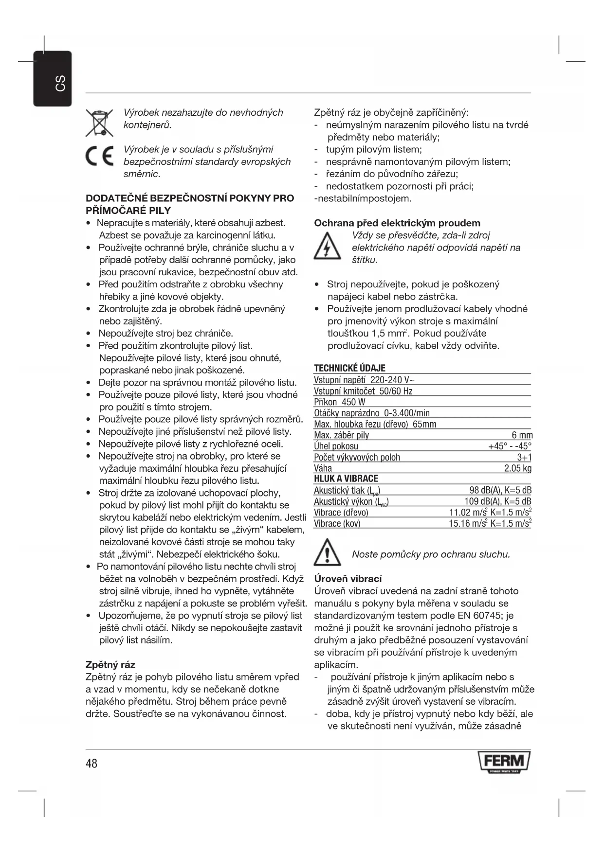 - Upozorňujeme, že po vypnutí stroje se pilový list ještě chvíli otáčí. Nikdy se nepokoušejte zastavit pilový list násilím. Zpětný ráz Zpětný ráz je pohyb pilového listu směrem vpřed a vzad v momentu, kdy se nečekaně dotkne nějakého předmětu. Stroj během práce pevně držte. Soustřeďte se na vykonávanou činnost. Zpětný ráz je obyčejně zapříčiněný: - neúmyslným narazením pilového listu na tvrdé předměty nebo materiály; - tupým pilovým listem; - nesprávně namontovaným pilovým listem; - řezáním do původního zářezu; - nedostatkem pozornosti při práci; - nestabilním postojem. Ochrana před elektrickým proudem Vždy se přesvědčte, zda-li zdroj elektrického napětí odpovídá napětí na štítku.
