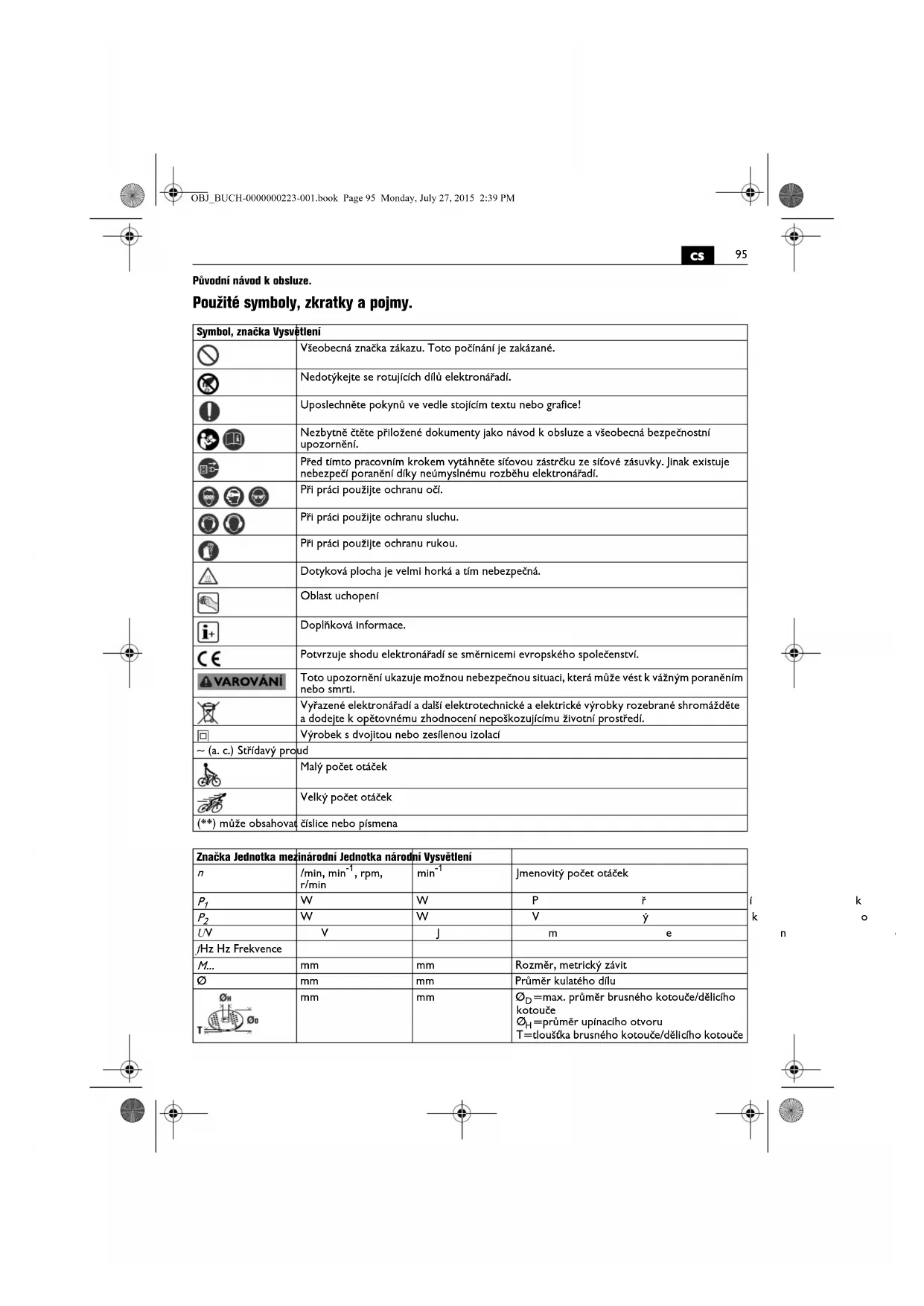 Původní návod k obsluze. Použité symboly, zkratky a pojmy. Symbol, značka Vysvětlení Všeobecná značka zákazu. Toto počínání je zakázané. Nedotýkejte se rotujících dílů elektronářadí. Uposlechněte pokynů ve vedle stojícím textu nebo grafice! Nezbytně čtěte přiložené dokumenty jako návod k obsluze a všeobecná bezpečnostní upozornění. Před tímto pracovním krokem vytáhněte síťovou zástrčku ze síťové zásuvky. Jinak existuje nebezpečí poranění díky neúmyslnému rozběhu elektronářadí. Při práci použijte ochranu očí. Při práci použijte ochranu sluchu. Při práci použijte ochranu rukou. Dotyková plocha je velmi horká a tím nebezpečná. Oblast uchopení Doplňková informace. Potvrzuje shodu elektronářadí se směrnicemi evropského společenství. Toto upozornění ukazuje možnou nebezpečnou situaci, která může vést k vážným poraněním nebo smrti. Vyřazené elektronářadí a další elektrotechnické a elektrické výrobky rozebrané shromážděte a dodejte k opětovnému zhodnocení nepoškozujícímu životní prostředí. Výrobek s dvojitou nebo zesílenou izolací ~ (a. c.) Střídavý proud Malý počet otáček Velký počet otáček (**) může obsahovat číslice nebo písmena Značka Jednotka mezinárodní Jednotka národní Vysvětlení