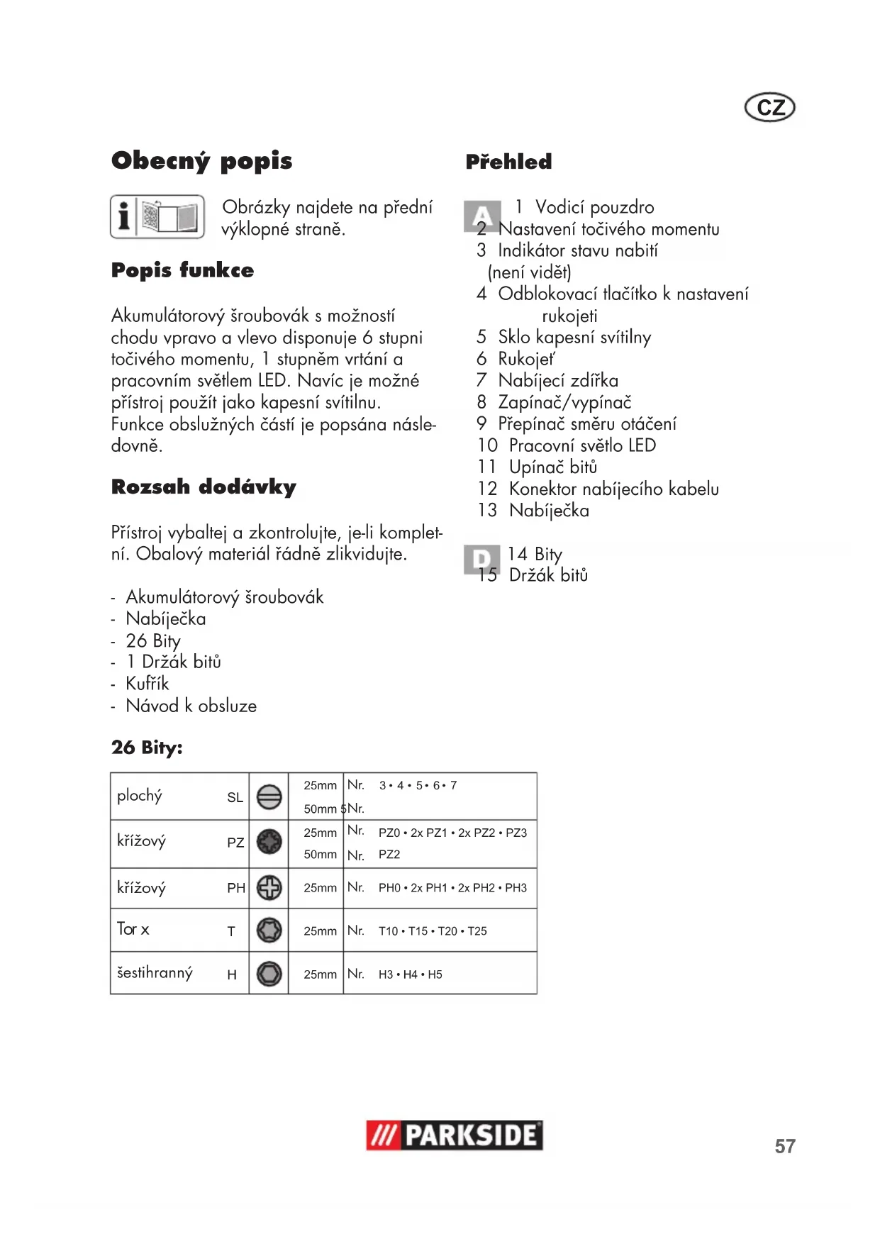 Obecný popis Obrázky najdete na přední výklopné straně. Popis funkce Akumulátorový šroubovák s možností chodu vpravo a vlevo disponuje 6 stupni točivého momentu, 1 stupněm vrtání a pracovním světlem LED. Navíc je možné přístroj použít jako kapesní svítilnu. Funkce obslužných částí je popsána násle- dovně. Rozsah dodávky Přístroj vybaltej a zkontrolujte, je-li komplet- ní. Obalový materiál řádně zlikvidujte. - Akumulátorový šroubovák - Nabíječka - 26 Bity - 1 Držák bitů - Kufřík - Návod k obsluze 26 Bity: plochý Nr. Nr. Nr. Nr. Nr. Nr. Nr. křížový křížový Tor x šestihranný
