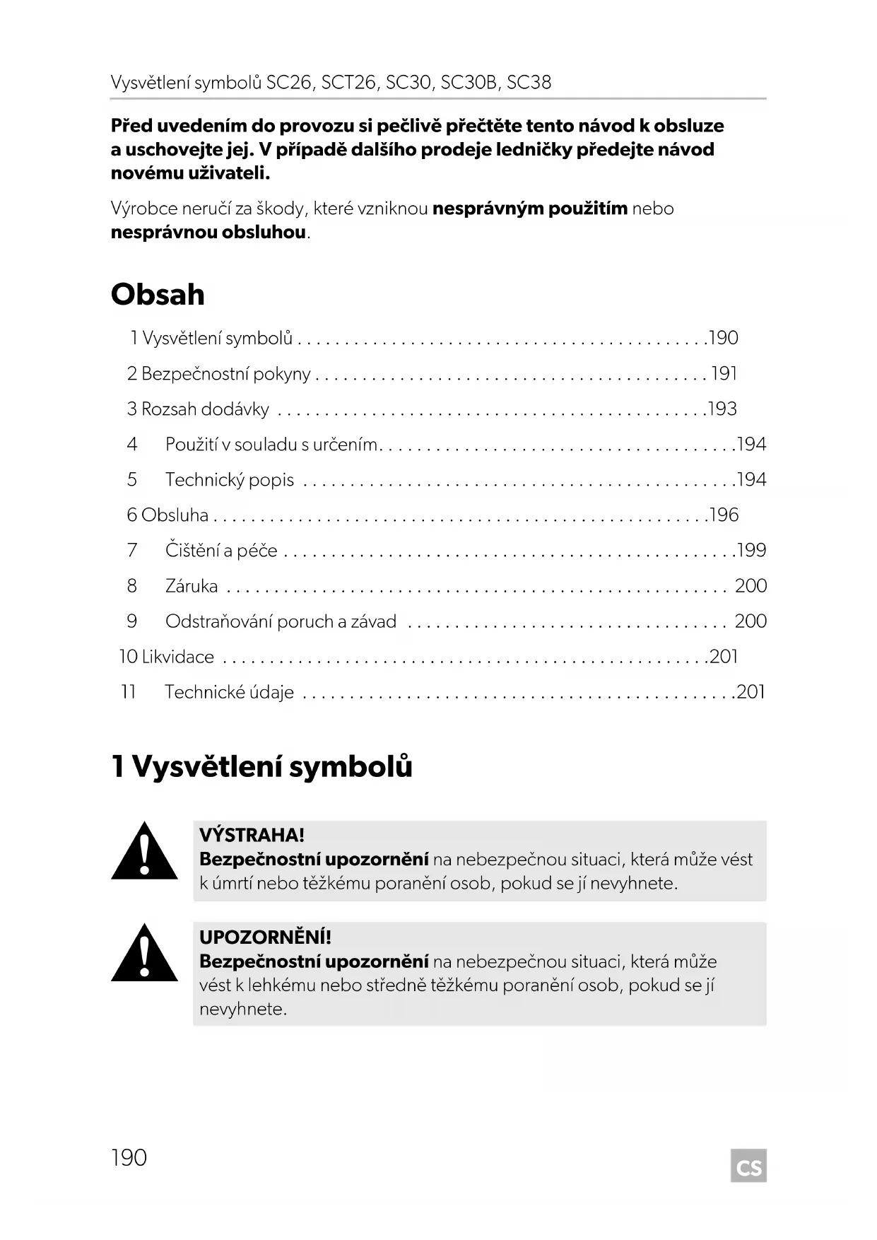 - Před uvedením do provozu si pečlivě přečtěte tento návod k obsluze a uschovejte jej. V případě dalšího prodeje ledničky předejte návod novému uživateli. Výrobce neručí za škody, které vzniknou nesprávným použitím nebo nesprávnou obsluhou. Obsah 1 Vysvětlení symbolů p. 190