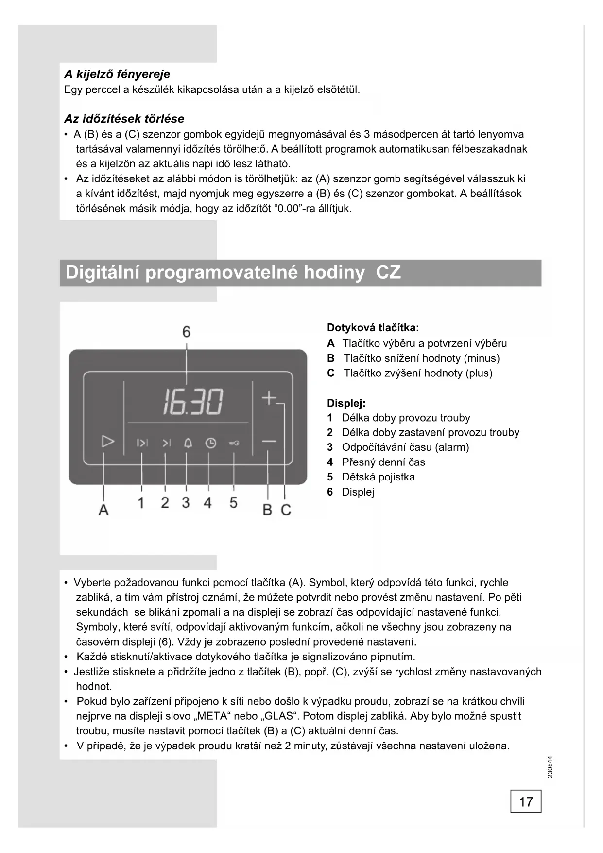 - Jakékoli nastavení programovatelných hodin může být také smazáno následujícím způsobem: vyberte funkci stiskem tlačítka (A), poté stiskněte zároveň tlačítko (B) a (C). Další cestou ke zrušení nastavené funkce je nastavit její hodnotu na „0.00”. Dotykové tlačidlá: A Tlačidlo voľby nastavenia potvrdenia B Dotykové tlačidlo zníženia hodnoty (mínus) C Dotykové tlačidlo zvýšenia hodnoty (plus) Displej: 1 Trvanie prevádzky rúry 2 Čas vypnutia rúry 3 Alarm časovača 4 Aktuálny čas 5 Detský zámok 6 Hodiny - zobrazenie času