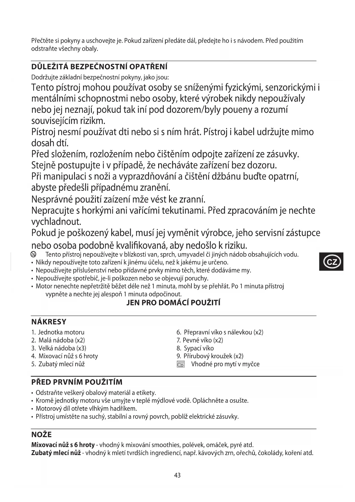 - Přístroj umístěte na suchý, stabilní a rovný povrch, poblíž elektrické zásuvky. NOŽE Mixovací nůž s 6 hroty - vhodný k mixování smoothies, polévek, omáček, pyré atd. Zubatý mlecí nůž - vhodný k mletí tvrdších ingrediencí, např. kávových zrn, ořechů, čokolády, koření atd.