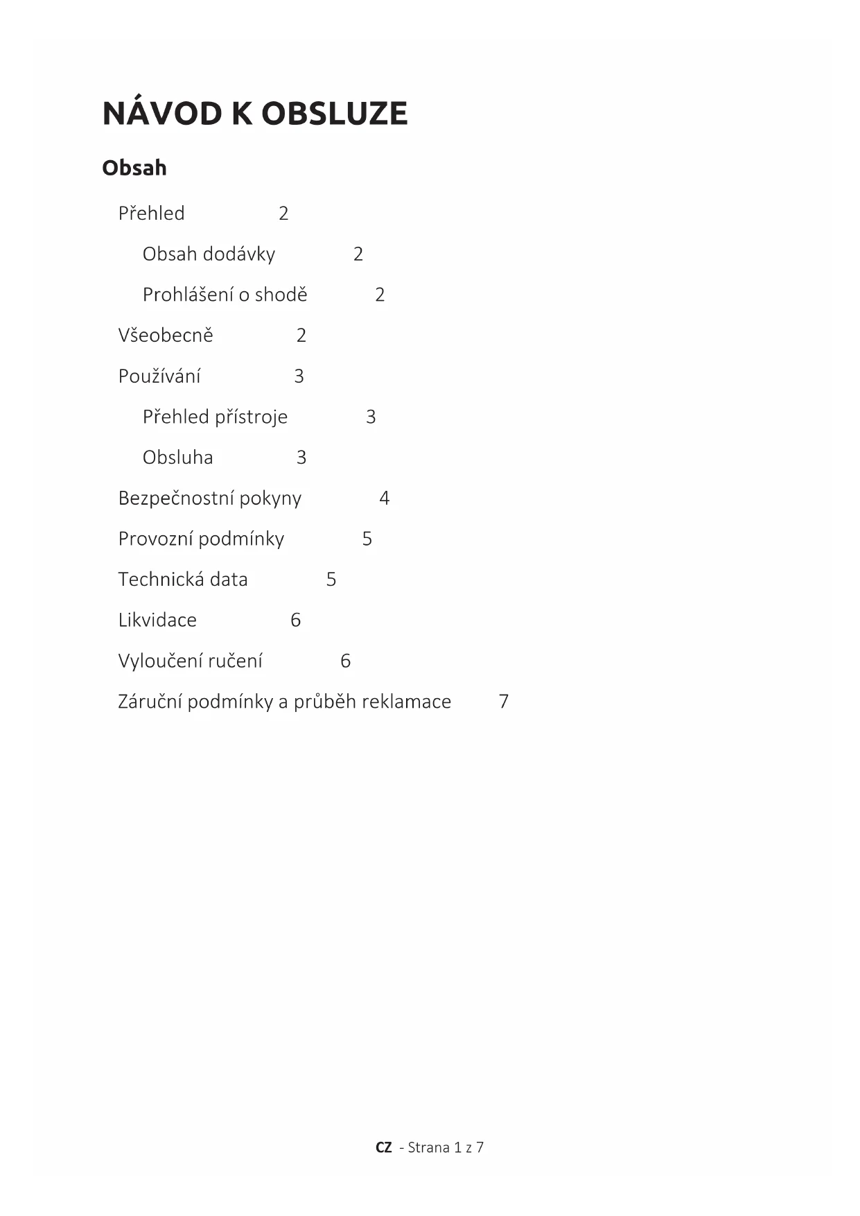 Děčastopodceňujínebezpečí,nebojejvůbecneidenkují.Tentopřístrojneníurčenýk tomu,abyjejpoužívaliosoby(takédě)somezenýmisenzorickými,fyzickýmineboduševními schopnostminebonedostatkemzkušenosa/nebonedostatkemznalos,ledažejsouprojejich bezpečnostpoddohledemkompetentníosobyneboobdrželipokyny,jakpoužívatpřístroja pochopilinebezpečí,kterávycházízpřístroje.Děbezdohledunemůžoumítpřístupkpřístroji. Ujistětese,žesiděnehrajíspřístrojem. Nebezpečí pro děti a osoby s omezenými fyzickými, senzorickými nebo duševními schopnostmi: b) Nabíjení přístrojů přes powerbanku TatopowerbankadisponujepřípojkouUSBA(OUT)(výstup2.1A)aintegrovanýmkabelem USBsezástrčkoutypuC(OUT)(výstup2.1A). Existujídvěmožnosnabíjenípřístrojeprostřednictvímpowerbanky: Možnost1:SpojtepřípojkutypuC(OUT)integrovanéhokabeluspřípojkoutypuC nabíjenéhopřístroje.Nabíjecíprocessespusautomacky. Možnost2:SpojtedodávanýUSBkabelsUSBApřípojkou(OUT)napowerbanceadruhý konecUSBkabeluspřípojkoumicroUSBnabíjenéhopřístroje. Pomocípowerbankymůžetenabíjetsoučasnědvapřístroje,napříkladtabletnapřípojceUSB A(OUT)asmaronpřesintegrovanýkabelstypemzástrčkyC(OUT). PřirozeněmůžetepoužíttakésvůjvlastníUSBnabíjecíkabel,abystespojilipowerbankuse svýmpřístrojem.Musítealerespektovat,žepřístrojelzenabíjetpouzepřespřípojkuUSBA (OUT)powerbanky. Pokudsenabíjípřístrojprostřednictvímpowerbankyakapacitapowerbankyjetéměř vyčerpána,zobrazujesetoblikánímposledníhostavuLED.Musíteopětnabítpowerbanku. Respektujte,žeběhemnabíjenípřístrojepomocípowerbankysespotřebujepřibližně30% celkovékapacityprostřednictvímnabíjecíhoprocesu.Jetopodmíněnonapříkladztrátou tepelnéhovýkonuspínacíhookruhuazměnounapě. Proopmálnívýkonnostsemusípravidelněpoužívatpowerbanka.Pokudbytomutak nebylo,musítenabíjetpowerbankuúplněminimálněkaždétřiměsíce. Postarejteseoto,abybylomožnéodevzdávatteplopřístroje,vznikajícíběhemnabíjecího procesu(videálnímpřípaděpoložtepowerbankuběhempoužívánínapevnoupodložku odolnouproteplu). Nepoužívejtepřístrojvextrémněchladných,horkých,vlhkýchneboprašnýchoblastech. Nevystavujtepřístrojpřímémuslunečnémuzáření.Chraňteproduktpředotevřenýmohněm. Hrozírizikoexploze! Chraňtepřístrojvkaždémprovoznímstavupřednárazemapádem. Všeobecné informaceCZ-Strana5z7 Tentopřístrojjecitlivýnaelektrostackévýboje.Chraňteprotopřístrojpředkaždýmmožným elektrostackýmvýbojem. Abysezamezilochybnýmfunkcím,nespojujtevýstupnípřípojkyUSBpřístrojespřípojkamiUSB počítačůnebojinýchpřístrojů.Jsouurčenépouzeknabíjenípřístrojů. Nerozebírejtepřístrojnasamostatnésoučástkyanepokoušejtesejejsamiopravovat.Neobsahuje dílykúdržběavtomtopřípadězanikázáruka. Nezasunujtepředměty,kterénejsounaplánovanékpouži,dootvorůproduktu.Mohlobytovést kelektrickémuzkratuajímzpůsobenémupožáru. Neobsluhujtepřístrojmokrýmarukama. Kčištěnípřístrojenepoužívejtevodunebochemickéroztoky.Použijtekčištěnísuchýhadřík. Nepokoušejtesesamiopravovatpřístroj.Zárukazanikávtomtopřípadě: Přístrojvytvářípřipoužíváníteplo,jetopřirozené.Produktnelzeběhempoužívánízakrývat. Nepoužívejtepřístroj,pokudvykazujeviditelnéškody,nebojevlhký. TECHNICKÁ DATA