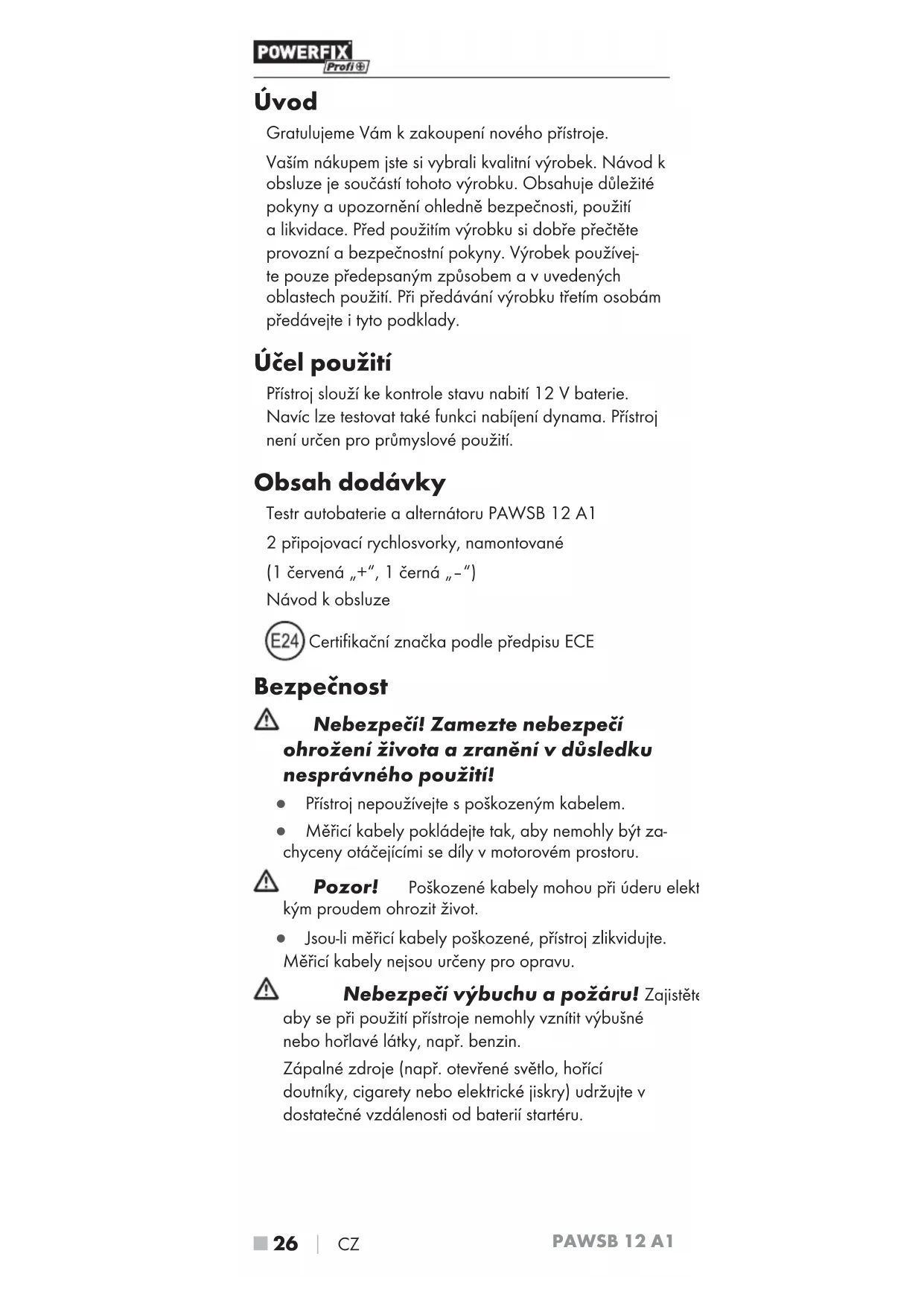 CZ Úvod Gratulujeme Vám k zakoupení nového přístroje. Vaším nákupem jste si vybrali kvalitní výrobek. Návod k obsluze je součástí tohoto výrobku. Obsahuje důležité pokyny a upozornění ohledně bezpečnosti, použití a likvidace. Před použitím výrobku si dobře přečtěte provozní a bezpečnostní pokyny. Výrobek používej- te pouze předepsaným způsobem a v uvedených oblastech použití. Při předávání výrobku třetím osobám předávejte i tyto podklady. Účel použití Přístroj slouží ke kontrole stavu nabití 12 V baterie. Navíc lze testovat také funkci nabíjení dynama. Přístroj není určen pro průmyslové použití. Obsah dodávky Testr autobaterie a alternátoru PAWSB 12 A1 2 připojovací rychlosvorky, namontované (1 červená „+“, 1 černá „–“) Návod k obsluze Certifikační značka podle předpisu ECE Bezpečnost Nebezpečí! Zamezte nebezpečí ohrožení života a zranění v důsledku nesprávného použití! Ɣ Přístroj nepoužívejte s poškozeným kabelem. Ɣ Měřicí kabely pokládejte tak, aby nemohly být za- chyceny otáčejícími se díly v motorovém prostoru. Pozor! Poškozené kabely mohou při úderu elektric- kým proudem ohrozit život. Ɣ Jsou-li měřicí kabely poškozené, přístroj zlikvidujte. Měřicí kabely nejsou určeny pro opravu. Nebezpečí výbuchu a požáru! Zajistěte, aby se při použití přístroje nemohly vznítit výbušné nebo hořlavé látky, např. benzin. Zápalné zdroje (např. otevřené světlo, hořící doutníky, cigarety nebo elektrické jiskry) udržujte v dostatečné vzdálenosti od baterií startéru.PAWSB 12 A1 CZ