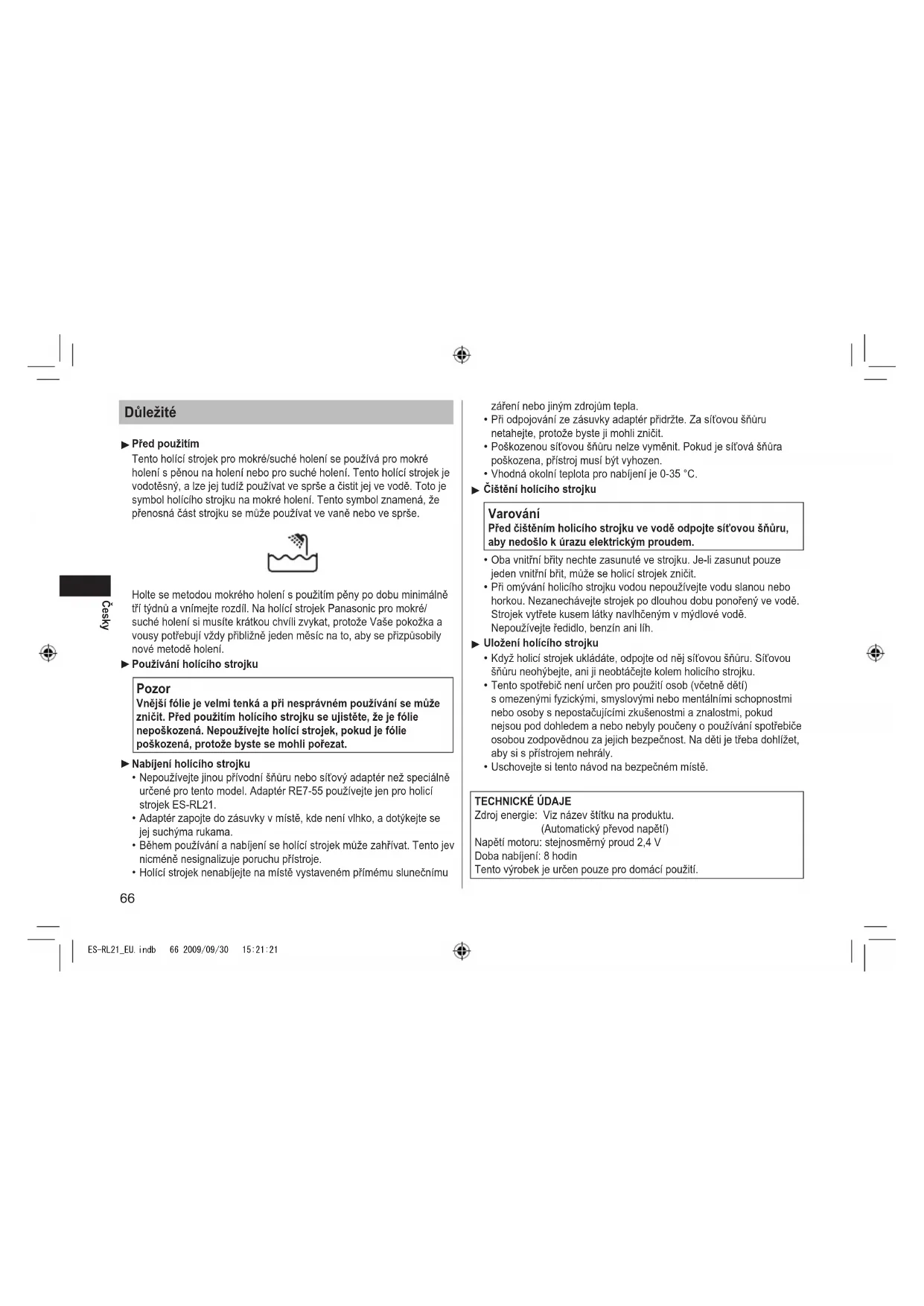 baterie na místech k tomu určených, za což neplatíte žádné poplatky, v souladu s platnými národnímu předpisy a se Směrnicemi 2002/96/EU a 2006/66/EU. Správnou likvidací přístrojů a baterií pomůžete šetřit cenné suroviny a předcházet možným negativním účinkům na lidské zdraví a na přírodní prostředí, které jinak mohou vzniknout při nesprávném zacházení s odpady. Další informace o sběru, likvidaci a recyklaci starých přístrojů a použitých baterií Vám poskytnou místní úřady, provozovny sběrných dvorů nebo prodejna, ve které jste toto zboží zakoupili. Při nesprávné likvidaci odpadu vám hrozí pokuta v souladu s národní legislativou a místními předpisy. Informace pro právnické osoby se sídlem v zemích Evropské Unie (EU) Pokud chcete likvidovat elektrická nebo elektronická zařízení, obraťte se na prodejce nebo dodavatele s žádostí o další informace. [Informace o likvidaci v zemích mimo Evropskou Unii (EU)] Tyto symboly platí jen v zemích Evropské unie. Pokud chcete likvidovat tento produkt, obraťte se na místní úřady nebo prodejce a informujte se o správném způsobu likvidace. Poznámka k symbolu baterie (symboly uprostřed a dole) Tento symbol může být použit v kombinaci s chemickým symbolem. V tomto případě splňuje tento symbol legislativní požadavky, které jsou předepsány pro chemickou látku obsaženou v baterii. ES-RL21_EU.indb 70 2009/09/30 15:21:2271 Slovensky Dôležité Pred použitím Tento holiaci strojček na mokré a suché holenie je možné použiť na mokré holenie s penou alebo na suché holenie. Je vodotesný a môžete ho použiť v sprche a čistiť ho pod vodou. Toto je symbol holiaceho strojčeka na mokré holenie. Tento symbol znamená, že prenosnú časť je možné použiť vo vani alebo v sprche. Hoľte sa spôsobom mokrého holenia s penou na holenie minimálne tri týždne a všímajte si rozdiel. Na holiaci strojček na mokré a suché holenie si musíte chvíľu zvykať, pretože vaša pokožka i brada vyžadujú vždy asi mesiac na to, aby sa prispôsobili novému spôsobu holenia. Používanie holiaceho strojčeka Pozor Vonkajšia fólia je veľmi tenká a pri nesprávnom použití sa môže poškodiť. Predtým, ako strojček použijete, skontrolujte, či nie je fólia poškodená. V prípade, že je napríklad fólia poškodená, strojček nepoužívajte. Mohlo by dôjsť k porezaniu. Nabíjanie holiaceho strojčeka Nepoužívajte napájací kábel, alebo napájací adaptér, ktoré nie sú vyslovene určené pre tento model. Adaptér RE7‑55 používajte jedine v spojení s holiacim strojčekom ES‑RL21. Pripojte adaptér do domácej elektrickej zásuvky na mieste, kde nie je vlhko a manipulujte s ním suchými rukami. Holiaci strojček sa môže počas používania a nabíjania zahriať. Tento jav však nie je porucha. Nenabíjajte holiaci strojček na mieste vystavenom priamemu slnečnému žiareniu alebo inému zdroju tepla.