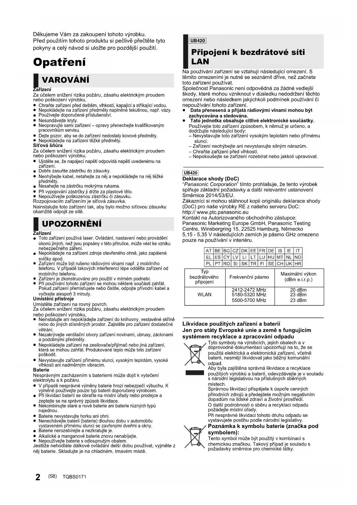 - er et varemærke tilhørende Verance Corporation. Beskyttet af U.S. Patent 7.369.677 og verdensomfattende patenter, der enten er udstedt eller under behandling, under licens af Verance Corporation. Alle rettigheder forbeholdes. Dette produkt indeholder følgende software: (1) softwaren er udviklet selvstændigt af eller for Panasonic Corporation, (2) software, som tilhører tredjemand og er givet i licens til Panasonic Corporation, (3) softwaren er givet i licens i henhold til GNU General Public License, Version 2.0 (GPL V2.0), (4) softwaren er givet i licens i henhold til GNU LESSER General Public License, Version 2.1 (LGPL V2.1) og/eller, (5) anden open source-software end software givet i licens i henhold til GPL V2.0 og/eller LGPL V2.1. Den software, der kategoriseres som (3) - (5), distribueres i håb om, at den må være nyttig, men UDEN GARANTI HERFOR, heller ikke med den stiltiende garanti for SALGBARHED eller EGNETHED TIL ET BESTEMT FORMÅL. Der henvises til de detaljerede vilkår og betingelser som angivet i menuen Player Settings. I mindst tre (3) år fra levering af dette produkt vil Panasonic give enhver tredjemand, som måtte kontakte os gennem nedenstående kontaktoplysninger og mod betaling af et gebyr, som ikke overstiger vores omkostninger for den fysiske distribution af kildekode, en komplet tilsvarende kildekode i maskinlæsbar form i henhold til GPL V2.0, LGPL V2.1 eller andre licenser med en forpligtelse og den relevante meddelelse om ophavsret herom. Kontaktoplysninger: oss-cd-request@gg.jp.panasonic.com Kildekoden og meddelelsen om ophavsret er også tilgængelig helt gratis på nedenstående websted. https://panasonic.net/cns/oss/ (1) MS/WMA Dette produkt er beskyttet af visse intellektuelle rettigheder tilhørende Microsoft Corporation og tredjeparter. Anvendelse eller distribution af en sådan teknologi udover dette produkt er forbudt uden licens fra Microsoft eller et autoriseret Microsoft-datterselskab eller tredjeparter. (2) MS/PlayReady/Endelig produktmærkning Dette produkt indeholder teknologi, som er underlagt visse immaterialrettigheder for Microsoft. Brugen eller distributionen af denne teknologi uden for produktet er ikke tilladt uden relevant eller relevante licenser fra Microsoft. (3) MS/PlayReady/Meddelelser til slutbrugere Indholdsejere bruger Microsoft PlayReady™ indholdsadgangsteknologi for at beskytte deres immaterialrettigheder, herunder copyright-indhold. Denne enhed anvender PlayReady-teknologi for at få adgang til PlayReady-beskyttet indhold og/eller WMDRM-beskyttet indhold. Hvis enheden ikke opfylder begrænsninger korrekt, hvad angår brug af indhold, kan indholdsejerne kræve, at Microsoft tilbagekalder enhedens ret til at bruge PlayReady-beskyttet indhold. Tilbagekaldelsen bør ikke påvirke ikke-beskyttet indhold eller indhold, der er beskyttet af andre indholdsadgangsteknologier. Indholdsejere kan kræve, at du opgraderer PlayReady for at få adgang til deres indhold. Hvis du afviser en sådan opdatering, kan du ikke få adgang til indhold, som kræver opdateringen. (4) Vorbis, FLAC, [UB420] WPA Supplicant Softwarelicenserne vises, når “Software Licence” i indstillingsmenuen vælges.* *[HOME] > “Setup” > “Player Settings” > “System” > “System Information” (57) TQBS0171-Safety_dan.fm 9 ページ 2018年2月26日 月曜日 午後4時52分2 TQBS0171 Děkujeme Vám za zakoupení tohoto výrobku. Před použitím tohoto produktu si pečlivě přečtěte tyto pokyny a celý návod si uložte pro pozdější použití. Opatření ZařízeníZa účelem snížení rizika požáru, zásahu elektrickým proudem nebo poškození výrobku, Chraňte zařízení před deštěm, vlhkostí, kapající a stříkající vodou. Nepokládejte na zařízení předměty naplněné tekutinou, např. vázy. Používejte doporučené příslušenství. Nesundávejte kryty. Neopravujte sami zařízení – opravy přenechejte kvalifikovaným pracovníkům servisu. Dejte pozor, aby se do zařízení nedostaly kovové předměty. Nepokládejte na zařízení těžké předměty.Síťová šňůraZa účelem snížení rizika požáru, zásahu elektrickým proudem nebo poškození výrobku, Ujistěte se, že napájecí napětí odpovídá napětí uvedenému na zařízení. Dobře zasuňte zástrčku do zásuvky. Neohýbejte kabel, netahejte za něj a nepokládejte na něj těžké předměty. Nesahejte na zástrčku mokrýma rukama. Při vypojování zástrčky ji držte za plastové tělo. Nepoužívejte poškozenou zástrčku či zásuvku.Rozpojovacím zařízením je síťová zásuvka.Nainstalujte toto zařízení tak, aby bylo možno síťovou zásuvku okamžitě odpojit ze sítě.Zařízení Toto zařízení používá laser. Ovládání, nastavení nebo provádění úkonů jiných, než jsou popsány v této příručce, může vést ke vzniku nebezpečného záření. Nepokládejte na zařízení zdroje otevřeného ohně, jako zapálené svíčky apod. Zařízení může být rušeno rádiovými vlnami např. z mobilního telefonu. V případě takových interferencí lépe oddělte zařízení od mobilního telefonu. Zařízení je zkonstruováno pro použití v mírném podnebí. Při používání tohoto zařízení se mohou některé součásti zahřát. Pokud zařízení přemisťujete nebo čistíte, odpojte přívodní kabel a vyčkejte alespoň 3 minuty.Umístění přístrojeUmístěte zařízení na rovný povrch.Za účelem snížení rizika požáru, zásahu elektrickým proudem nebo poškození výrobku, Neinstalujte ani nepokládejte zařízení do knihovny, vestavěné skříně nebo do jiných stísněných prostor. Zajistěte pro zařízení dostatečné větrání. Nezakrývejte ventilační otvory zařízení novinami, ubrusy, záclonami a podobnými předměty. Nepokládejte zařízení na zesilovače/přijímač nebo jiná zařízení, která se mohou zahřát. Produkované teplo může toto zařízení po