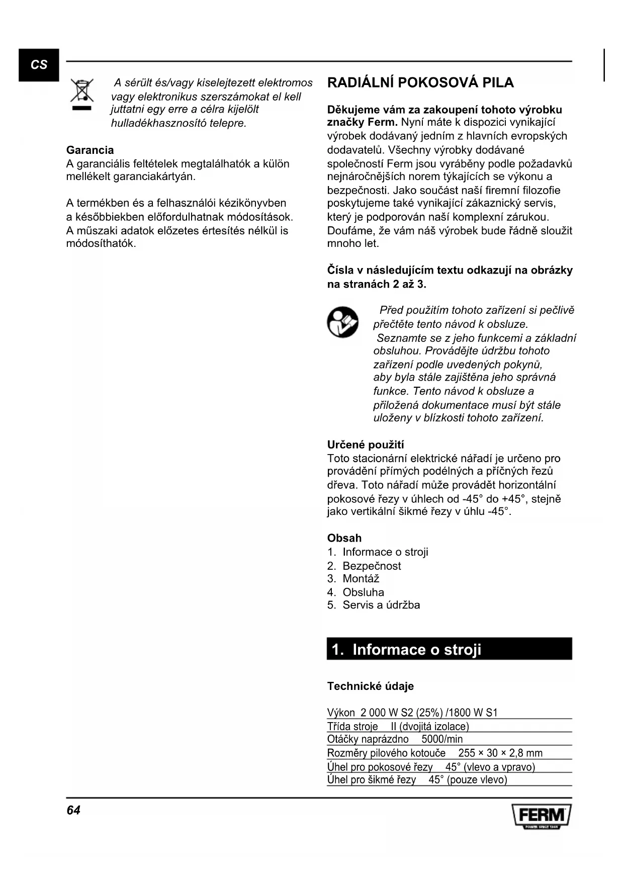 Děkujeme vám za zakoupení tohoto výrobku značky Ferm. Nyní máte k dispozici vynikající výrobek dodávaný jedním z hlavních evropských dodavatelů.Všechnyvýrobkydodávané společnostíFermjsouvyráběnypodlepožadavků nejnáročnějšíchnoremtýkajícíchsevýkonua bezpečnosti.Jakosoučástnašíremnílozoe poskytujeme také vynikající zákaznický servis, kterýjepodporovánnašíkomplexnízárukou. Doufáme,ževámnášvýrobekbudeřádněsloužit mnoho let. Čísla v následujícím textu odkazují na obrázky na stranách 2 až 3. Předpoužitímtohotozařízenísipečlivě přečtětetentonávodkobsluze. Seznamte se z jeho funkcemi a základní obsluhou.Provádějteúdržbutohoto zařízenípodleuvedenýchpokynů, abybylastálezajištěnajehosprávná funkce. Tento návod k obsluze a přiloženádokumentacemusíbýtstále uloženyvblízkostitohotozařízení. Určené použití Totostacionárníelektrickénářadíjeurčenopro prováděnípřímýchpodélnýchapříčnýchřezů dřeva.Totonářadímůžeprováděthorizontální pokosovéřezyvúhlechod-45°do+45°,stejně jakovertikálníšikméřezyvúhlu-45°. Obsah