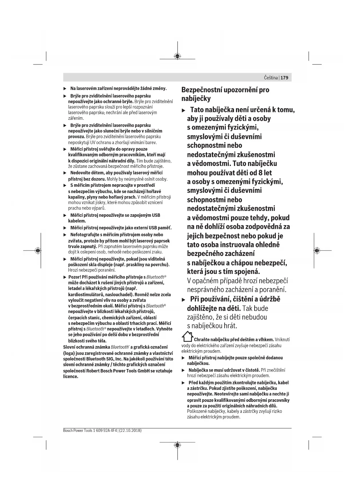 agrafická označení (loga) jsou zaregistrované ochranné známky avlastnictví společnosti Bluetooth SIG, Inc. Na jakékoli používání této slovní ochranné známky/ těchto grafických označení společností Robert Bosch Power Tools GmbH se vztahuje licence. Bezpečnostní upozornění pro nabíječky u Tato nabíječka není určená ktomu, aby ji používaly děti aosoby somezenými fyzickými, smyslovými či duševními schopnostmi nebo nedostatečnými zkušenostmi avědomostmi. Tuto nabíječku mohou používat děti od 8let aosoby somezenými fyzickými, smyslovými či duševními schopnostmi nebo nedostatečnými zkušenostmi avědomostmi pouze tehdy, pokud na ně dohlíží osoba zodpovědná za jejich bezpečnost nebo pokud je tato osoba instruovala ohledně bezpečného zacházení snabíječkou achápou nebezpečí, která jsou stím spojená. Vopačném případě hrozí nebezpečí nesprávného zacházení aporanění. u Při používání, čištění aúdržbě dohlížejte na děti. Tak bude zajištěno, že si děti nebudou snabíječkou hrát. Chraňte nabíječku před deštěm avlhkem. Vniknutí vody do elektrického zařízení zvyšuje nebezpečí zásahu elektrickým proudem. u Měřicí přístroj nabíjejte pouze společně dodanou nabíječkou. u Nabíječka se musí udržovat včistotě. Při znečištění hrozí nebezpečí zásahu elektrickým proudem. u Před každým použitím zkontrolujte nabíječku, kabel azástrčku. Pokud zjistíte poškození, nabíječku nepoužívejte. Neotevírejte sami nabíječku anechte ji opravit pouze kvalifikovanými odbornými pracovníky apouze za použití originálních náhradních dílů. Poškozené nabíječky, kabely azástrčky zvyšují riziko zásahu elektrickým proudem. Čeština | 179 Bosch Power Tools 1 609 92A 4F4 | (22.10.2018)180 | Čeština 1 609 92A 4F4 | (22.10.2018) Bosch Power Tools u Nabíječku nepoužívejte na snadno hořlavém podkladu (např. papíru, textiliích), resp. vhořlavém prostředí. Protože se nabíječka při provozu zahřívá, hrozí nebezpečí požáru. u Při poškození anesprávném použití akumulátoru mohou také unikat výpary. Přivádějte čerstvý vzduch apři potížích vyhledejte lékaře. Výpary mohou dráždit dýchací cesty. Popis výrobku avýkonu Otočte vyklápěcí stranu se zobrazením měřícího přístroje anechte tuto stranu během čtení návodu kobsluze otočenou. Použití vsouladu surčeným účelem Měřicí přístroj je určený kměření vzdáleností, délek, výšek, odstupů, sklonů apro výpočet ploch aobjemů. Výsledky měření lze přenášet na jiné přístroje přes Bluetooth® aUSB rozhraní. Měřicí přístroj je vhodný pro používání ve vnitřních avenkovních prostorech. Zobrazené součásti Číslování zobrazených komponent se vztahuje na zobrazení měřicího přístroje na obrázkové straně. (1) Displej (2) Tlačítko měření [ ] (lze použít vpředu nebo na straně) (3) Programovatelné tlačítko [ ] (4) Tlačítko plus[+]/výběr doprava (5) Tlačítko zoom (6) Uchycení poutka (7) Aktivační tlačítko měřicího kolíku (8) Měřicí kolík (9) Tlačítko zapnutí/vypnutí/vymazání [ ] (10) Tlačítko fotoaparátu (11) Tlačítko minus [−] /výběr doleva (12) Programovatelné tlačítko [ ] (13) Funkční tlačítko[Func] (14) Varovný štítek laseru (15) Sériové číslo (16) Mikro USB zdířka (17) Stativový závit 1/4" (18) Výstup laserového paprsku (19) Fotoaparát (20) Přijímací čočka (21) Poutko (22) Micro-USB kabel (23) Nabíječka