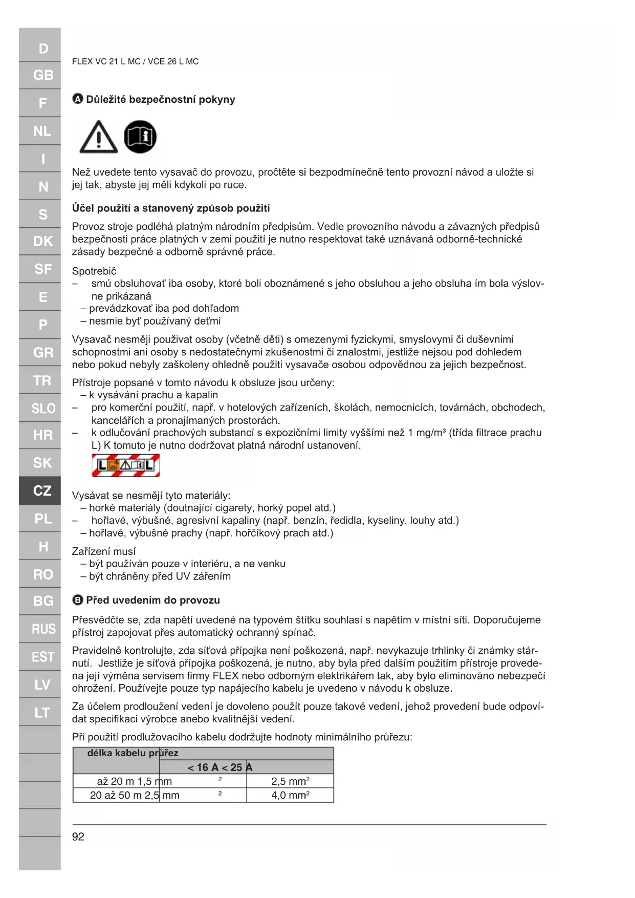 FLEX VC 21 L MC / VCE 26 L MC Používejte přístroj pouze v případě, že je v nepoškozeném stavu. Nikdy nevysávejte s poškozeným ltračním článkem. Jestliže se odpadní vzduch z přístroje vrací zpět do místnosti, je nutno, aby byla při vysávání prachu v takové místnosti zajištěna dostatečná výměna vzduchu (k tomuto je nutno dodržovat platná národní ustanovení). Personál, který bude provádět obsluhu přístroje, je nutno před zahájením práce informovat o: – manipulaci s přístrojem – o nebezpečích spojených s vysávaným materiálem – bezpečném způsobu odstranění a likvidace vysátého materiálu