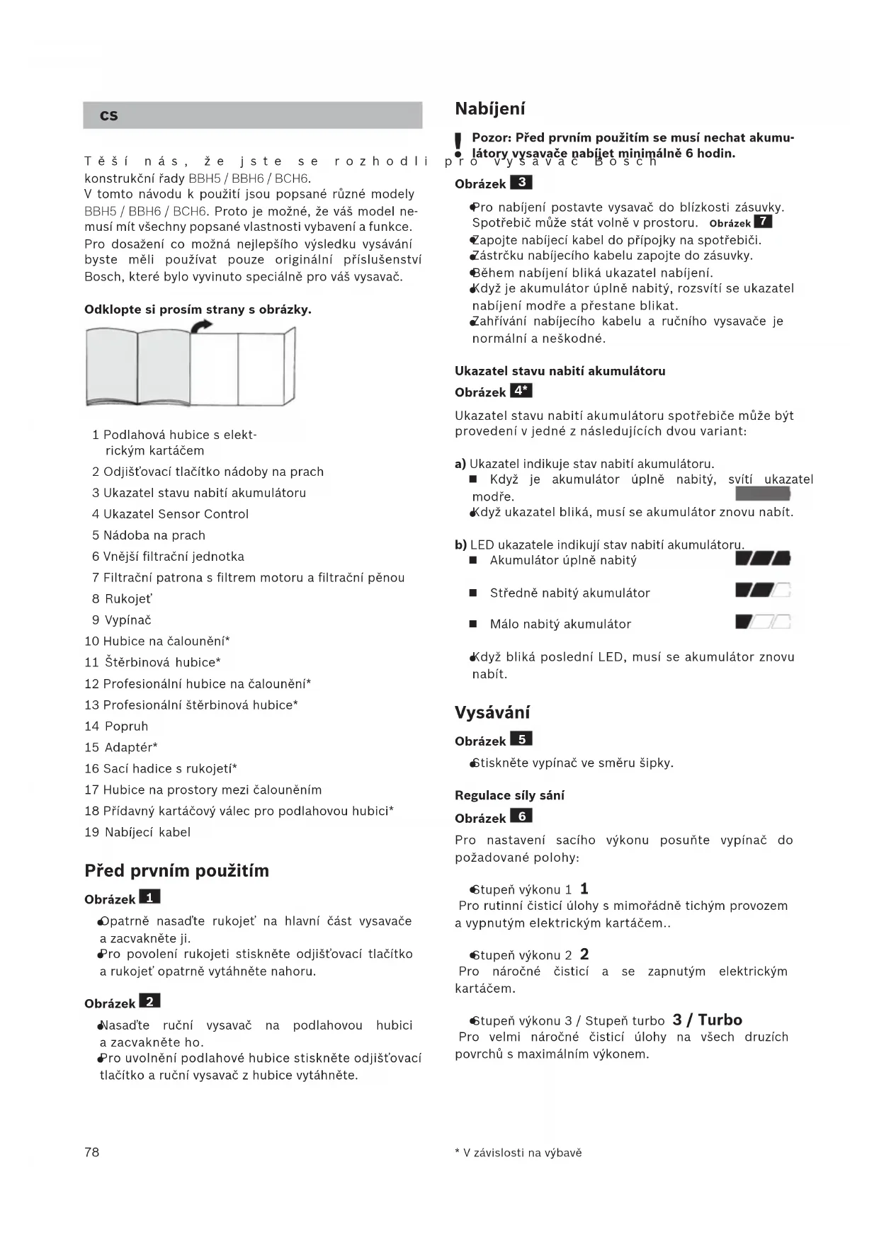 - V závislosti na výbavě Těší nás, že jste se rozhodli pro vysavač Bosch konstrukční řady BBH5 / BBH6 / BCH6. V tomto návodu k použití jsou popsané různé modely BBH5 / BBH6 / BCH6. Proto je možné, že váš model ne- musí mít všechny popsané vlastnosti vybavení a funkce. Pro dosažení co možná nejlepšího výsledku vysávání byste měli používat pouze originální příslušenství Bosch, které bylo vyvinuto speciálně pro váš vysavač. Odklopte si prosím strany s obrázky. 1 Podlahová hubice s elekt- rickým kartáčem 2 Odjišťovací tlačítko nádoby na prach 3 Ukazatel stavu nabití akumulátoru 4 Ukazatel Sensor Control 5 Nádoba na prach 6 Vnější filtrační jednotka 7 Filtrační patrona s filtrem motoru a filtrační pěnou 8 Rukojeť 9 Vypínač 10 Hubice na čalounění* 11 Štěrbinová hubice* 12 Profesionální hubice na čalounění* 13 Profesionální štěrbinová hubice* 14 Popruh 15 Adaptér* 16 Sací hadice s rukojetí* 17 Hubice na prostory mezi čalouněním 18 Přídavný kartáčový válec pro podlahovou hubici* 19 Nabíjecí kabel Před prvním použitím Obrázek
