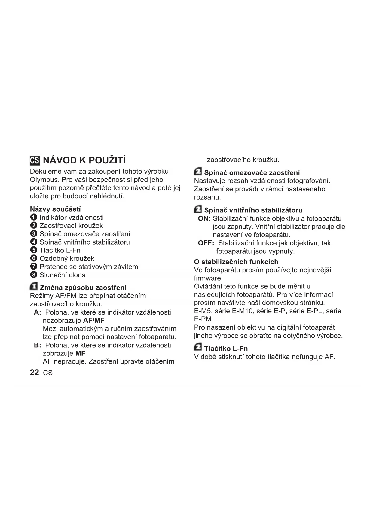 Děkujeme vám za zakoupení tohoto výrobku Olympus. Pro vaši bezpečnost si před jeho použitím pozorně přečtěte tento návod a poté jej uložte pro budoucí nahlédnutí. Názvy součástí 1 Indikátor vzdálenosti 2 Zaostřovací kroužek 3 Spínač omezovače zaostření 4 Spínač vnitřního stabilizátoru 5 Tlačítko L-Fn 6 Ozdobný kroužek 7 Prstenec se stativovým závitem 8 Sluneční clona Změna způsobu zaostření Režimy AF/FM lze přepínat otáčením zaostřovacího kroužku. A: Poloha, ve které se indikátor vzdálenosti nezobrazuje AF/MF Mezi automatickým a ručním zaostřováním lze přepínat pomocí nastavení fotoaparátu. B: Poloha, ve které se indikátor vzdálenosti zobrazuje MF AF nepracuje. Zaostření upravte otáčením zaostřovacího kroužku. Spínač omezovače zaostření Nastavuje rozsah vzdálenosti fotografování. Zaostření se provádí v rámci nastaveného rozsahu. Spínač vnitřního stabilizátoru ON: Stabilizační funkce objektivu a fotoaparátu jsou zapnuty. Vnitřní stabilizátor pracuje dle nastavení ve fotoaparátu. OFF: Stabilizační funkce jak objektivu, tak fotoaparátu jsou vypnuty. O stabilizačních funkcích Ve fotoaparátu prosím používejte nejnovější firmware. Ovládání této funkce se bude měnit u následujících fotoaparátů. Pro více informací prosím navštivte naši domovskou stránku. E-M5, série E-M10, série E-P, série E-PL, série E-PM Pro nasazení objektivu na digitální fotoaparát jiného výrobce se obraťte na dotyčného výrobce. Tlačítko L-Fn V době stisknutí tohoto tlačítka nefunguje AF. CSCS 23 Sejmutí prstence se stativovým závitem a upevnění ozdobného kroužku Sejmutí prstence se stativovým závitem: Otočte tlačítkem prstence se stativovým závitem doleva, abyste jej uvolnili 1. Otočte prstencem se stativovým závitem doleva, aby byl zarovnán se značkou 2 a sejměte jej z objektivu 3. Připevnění ozdobného kroužku: Zarovnejte značky a nasaďte ozdobný kroužek 1, poté jím otáčejte doprava, dokud se nezastaví 2. Jak používat sluneční clonu Vytahujte ji směrem ven, dokud se nezastaví 1 a poté jí otočte doprava 2. Sluneční clonu nelze z objektivu sejmout. Poznámky ke snímání