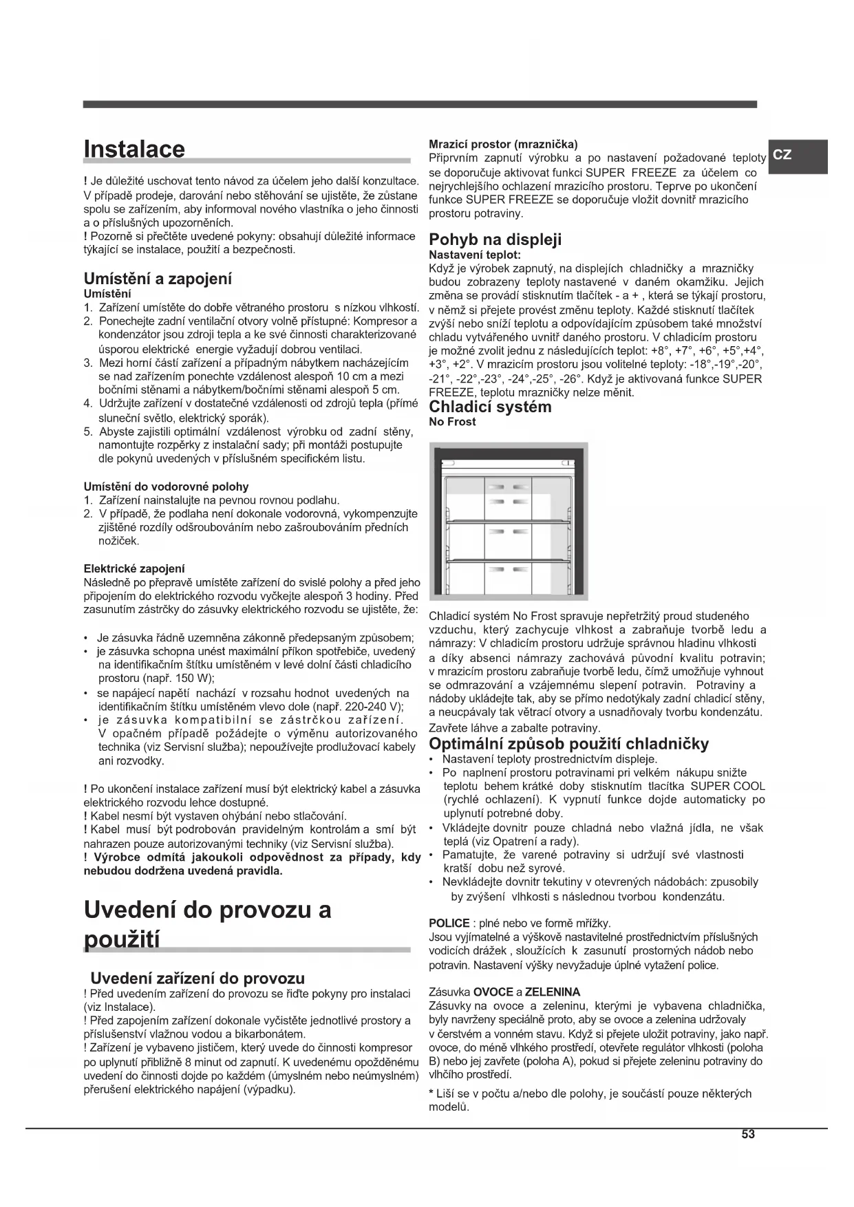 - je zásuvka kompatibilní se zástrčkou zařízení. V opačném případě požádejte o výměnu autorizovaného technika (viz Servisní služba); nepoužívejte prodlužovací kabely ani rozvodky. ! Po ukončení instalace zařízení musí být elektrický kabel a zásuvka elektrického rozvodu lehce dostupné. ! Kabel nesmí být vystaven ohýbání nebo stlačování. ! Kabel musí být podrobován pravidelným kontrolám a smí být nahrazen pouze autorizovanými techniky (viz Servisní služba). ! Výrobce odmítá jakoukoli odpovědnost za případy, kdy nebudou dodržena uvedená pravidla. Uvedení do provozu a použití Uvedení zařízení do provozu ! Před uvedením zařízení do provozu se řiďte pokyny pro instalaci (viz Instalace). ! Před zapojením zařízení dokonale vyčistěte jednotlivé prostory a příslušenství vlažnou vodou a bikarbonátem. ! Zařízení je vybaveno jističem, který uvede do činnosti kompresor po uplynutí přibližně 8 minut od zapnutí. K uvedenému opožděnému uvedení do činnosti dojde po každém (úmyslném nebo neúmyslném) přerušení elektrického napájení (výpadku). Mrazicí prostor (mraznička) Připrvním zapnutí výrobku a po nastavení požadované teploty se doporučuje aktivovat funkci SUPER FREEZE za účelem co nejrychlejšího ochlazení mrazicího prostoru. Teprve po ukončení funkce SUPER FREEZE se doporučuje vložit dovnitř mrazicího prostoru potraviny. Pohyb na displeji Nastavení teplot: Když je výrobek zapnutý, na displejích chladničky a mrazničky budou zobrazeny teploty nastavené v daném okamžiku. Jejich změna se provádí stisknutím tlačítek - a + , která se týkají prostoru, v němž si přejete provést změnu teploty. Každé stisknutí tlačítek zvýší nebo sníží teplotu a odpovídajícím způsobem také množství chladu vytvářeného uvnitř daného prostoru. V chladicím prostoru je možné zvolit jednu z následujících teplot: +8°, +7°, +6°, +5°,+4°, +3°, +2°. V mrazicím prostoru jsou volitelné teploty: -18°,-19°,-20°, -21°, -22°,-23°, -24°,-25°, -26°. Když je aktivovaná funkce SUPER FREEZE, teplotu mrazničky nelze měnit. Chladicí systém No Frost Chladicí systém No Frost spravuje nepřetržitý proud studeného vzduchu, který zachycuje vlhkost a zabraňuje tvorbě ledu a námrazy: V chladicím prostoru udržuje správnou hladinu vlhkosti a díky absenci námrazy zachovává původní kvalitu potravin; v mrazicím prostoru zabraňuje tvorbě ledu, čímž umožňuje vyhnout se odmrazování a vzájemnému slepení potravin. Potraviny a nádoby ukládejte tak, aby se přímo nedotýkaly zadní chladicí stěny, a neucpávaly tak větrací otvory a usnadňovaly tvorbu kondenzátu. Zavřete láhve a zabalte potraviny. Optimální způsob použití chladničky