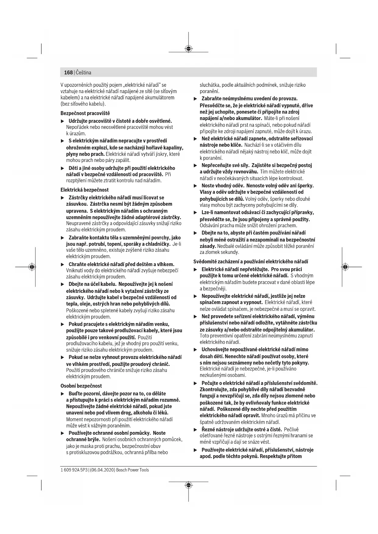 Úroveň vibrací aúroveň hluku, které jsou uvedené vtěchto pokynech, byly změřeny pomocí normované měřicí metody alze je použít pro vzájemné porovnání elektronářadí. Hodí se ipro předběžný odhad zatížení vibracemi ahlukem. Uvedená úroveň vibrací aúroveň hluku reprezentuje hlavní použití elektronářadí. Pokud se ovšem bude elektronářadí používat pro jiné práce, sjinými nástroji nebo snedostatečnou údržbou, může se úroveň hluku aúroveň vibrací lišit. To může zatížení vibracemi ahlukem po celou pracovní dobu zřetelně zvýšit. Pro přesný odhad zatížení vibracemi ahlukem by měly být zohledněny idoby, kdy je nářadí vypnuté nebo běží, ale ve Bosch Power Tools 1 609 92A 5P3 | (06.04.2020)174 | Čeština skutečnosti se nepoužívá. To může zatížení vibracemi ahlukem po celou pracovní dobu výrazně snížit. Stanovte dodatečná bezpečnostní opatření kochraně obsluhy před účinky vibrací, jako je např. údržba elektronářadí anástrojů, udržování teplých rukou, organizace pracovních procesů. Montáž Obsah dodávky Průmyslové akumulátorové šroubováky se dodávají bez akumulátoru, průmyslové akumulátorové úhlové šroubováky bez úhlové šroubovací hlavy abez akumulátoru. Při výběru vhodného příslušenství se prosím obraťte na specializovaného prodejce průmyslového nářadí Bosch. Provozní askladovací prostředí Elektronářadí je vhodné výhradně pro provoz vuzavřených prostorech. Pro bezchybný provoz by měla být přípustná teplota prostředí od −5°C do +50°C (od 23°F do 122°F), při přípustné relativní vlhkosti vzduchu od 20 do 95% bez rosení. Akumulátor by se měl skladovat při teplotě od 0°C (32°F) do 45°C (113°F), aby se zabránilo poškození akumulátorových článků. Montáž úhlové šroubovací hlavy BT-ANGLEEXACT 2 | 3 | 6 | 7 | 8 | 15 | 17 | 23 | 30 Utěchto průmyslových akumulátorových úhlových šroubováků se musí nejprve namontovat vhodná úhlová šroubovací hlava (viz „Technické údaje“, Stránka171). u Dříve než budete montovat, přestavovat nebo demontovat šroubovací hlavu, přesvědčte se, že je přepínač směru otáčení uprostřed (blokování zapnutí) nebo byl zelektronářadí odstraněn akumulátor. Pevně přidržte elektronářadí stranovým klíčem (6) za plochu pro nasazení klíče (5) na přírubě úhlové hlavy. u Elektronářadí nikdy neupínejte za části krytu. Nasaďte úhlovou šroubovací hlavu (3) vpožadované poloze na přírubu astranovým klíčem (4) na ploše pro nasazení klíče (16) utáhněte převlečnou matici. Stranovým klíčem (6) přitom přidržujte přírubu úhlové hlavy. BT-ANGLEEXACT 23 | 30 Tyto průmyslové akumulátorové úhlové šroubováky lze používat pouze súhlovou šroubovací hlavou