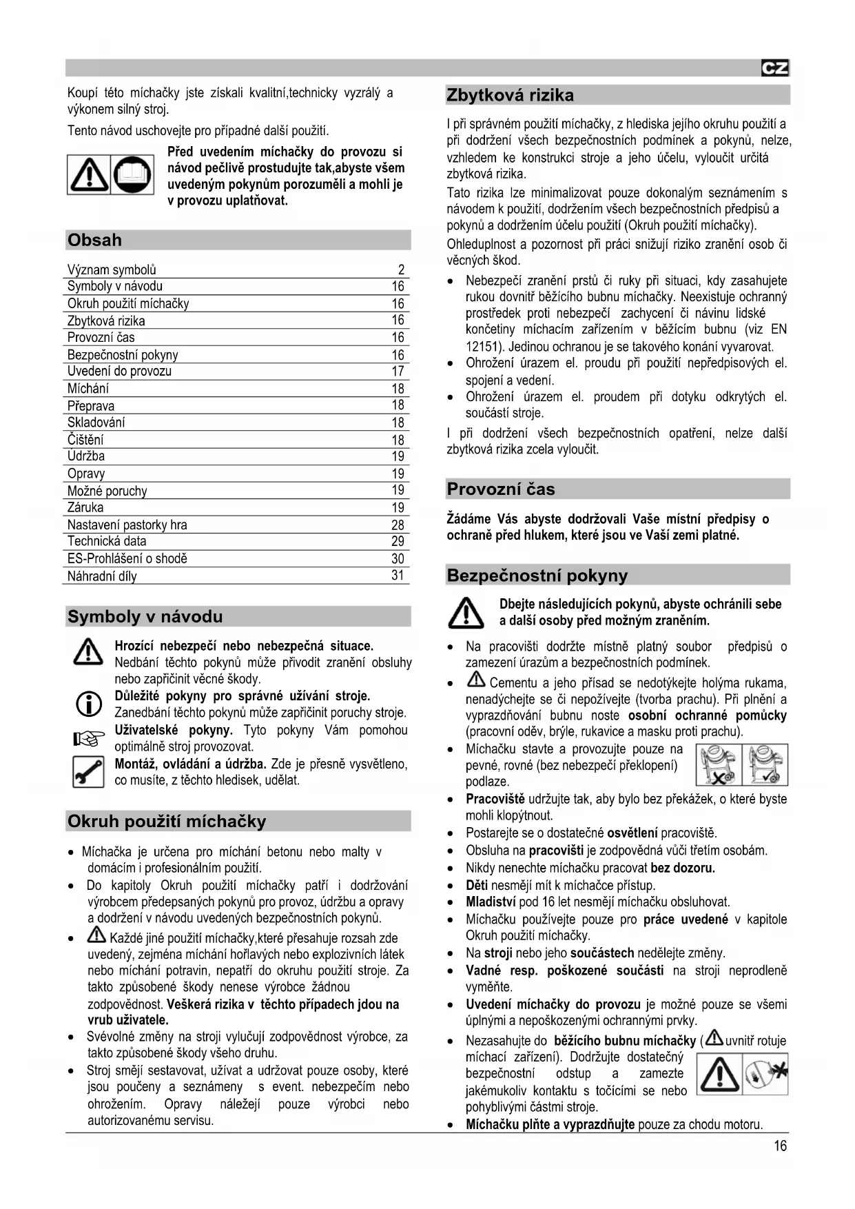 - Kaźde jiné použiti michačky, které prśesahuje rozsah zde uvedeny, zejměna micháni hořlavych nebo explozivnich látek nebo micháni potravin, nepatri do okruhu použiti stroje. Za takto zpusobene skody renese vyrobce zádnou zodpovednost. Veskerá rizika v těchto pripech jdou na vrub uzivatele.
