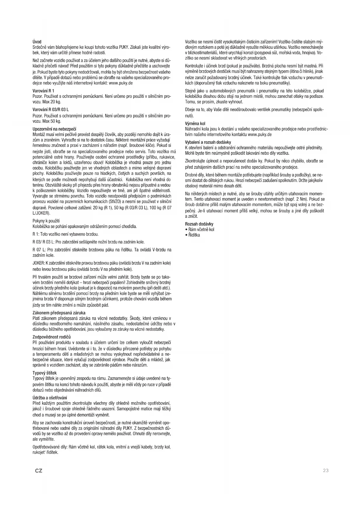 Než začnete vozidlo používat a za učelem jeho dalsho použiti je nutné, abyste si du kladně prěcěti návod! Před použití smу tytoPokyny dūkladné prěcěte a uschovejte je. Pokud bysté tytoPokyny nedodržovali, mohma bybyt ohrožena bezpečnost vaseho dítěte. V pripadě dotazu nebo problémů se obratte na vaseho specializovaného prodejece nebo vyuzijte naš internetovýkontakt: www.puky.de