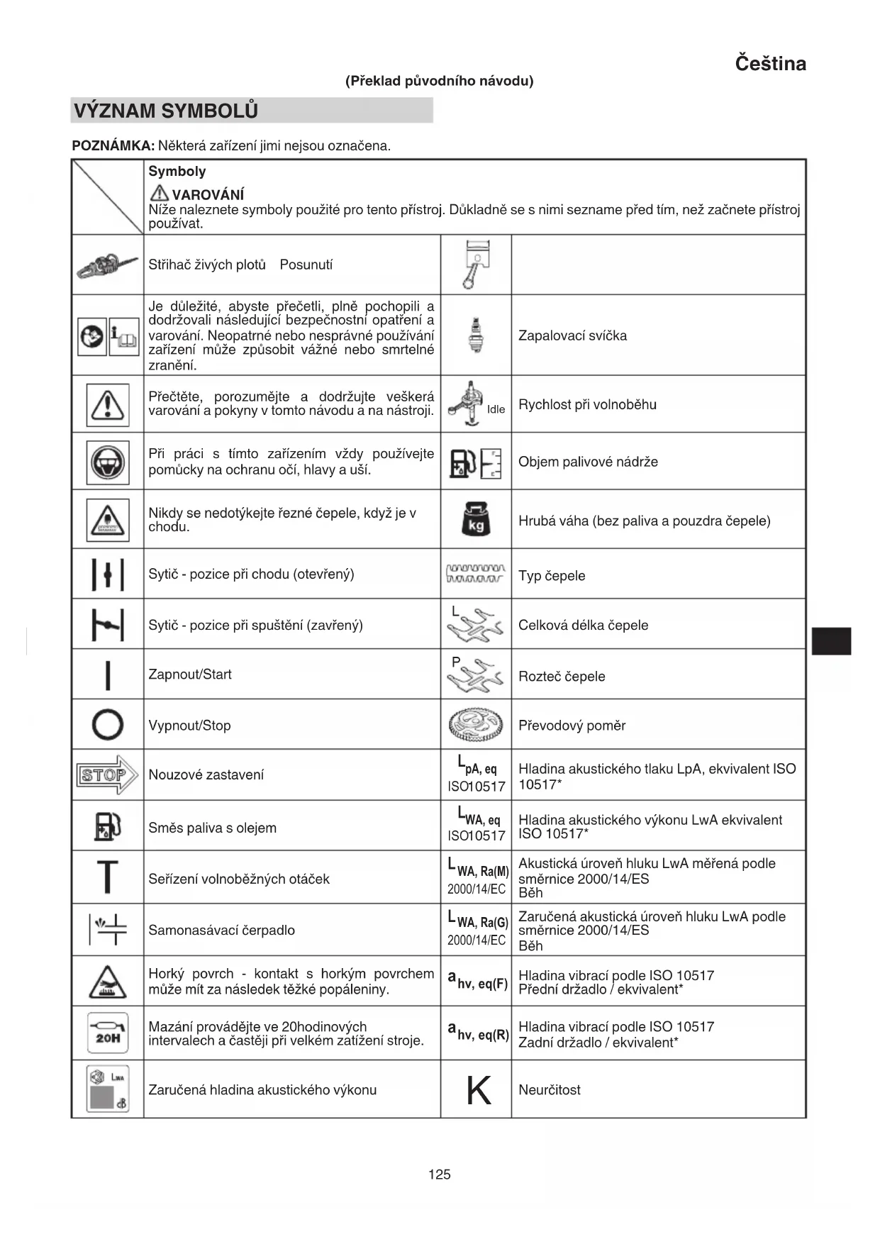 POZNÁMKA: Některá zařízení jimi nejsou označena. Symboly VAROVÁNÍ Níže naleznete symboly použité pro tento přístroj. Důkladně se s nimi sezname před tím, než začnete přístroj používat. Střihač živých plotů Posunutí Je důležité, abyste přečetli, plně pochopili a dodržovali následující bezpečnostní opatření a varování. Neopatrné nebo nesprávné používání zařízení může způsobit vážné nebo smrtelné zranění. Zapalovací svíčka Přečtěte, porozumějte a dodržujte veškerá varování a pokyny v tomto návodu a na nástroji. Idle Rychlost při volnoběhu Při práci s tímto zařízením vždy používejte pomůcky na ochranu očí, hlavy a uší. Objem palivové nádrže Nikdy se nedotýkejte řezné čepele, když je v chodu. Hrubá váha (bez paliva a pouzdra čepele) Sytič - pozice při chodu (otevřený) Typ čepele Sytič - pozice při spuštění (zavřený)