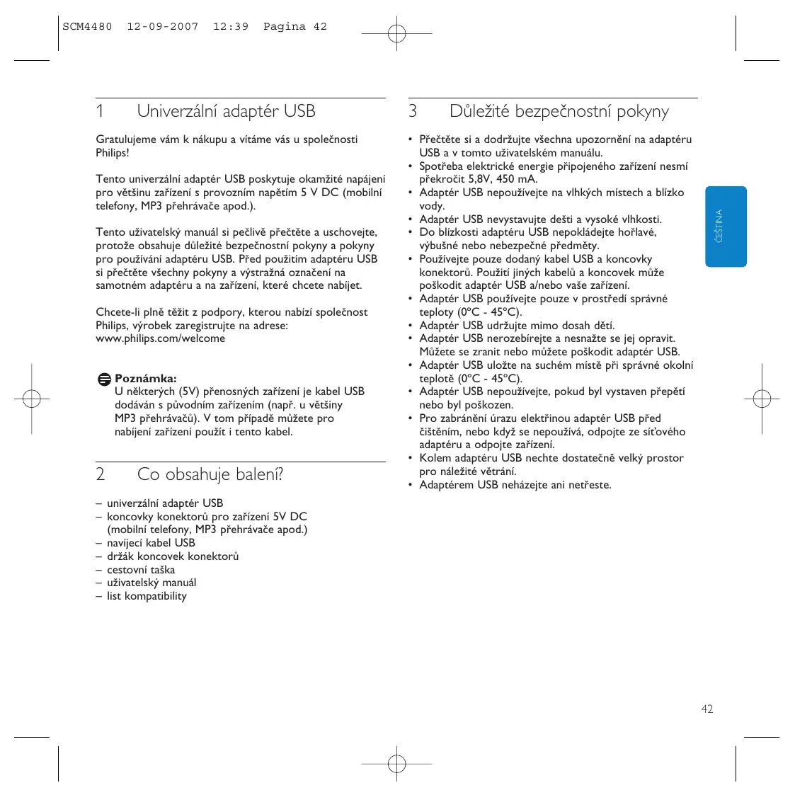 - Adaptérem USB neházejte ani netřeste. ĆEŠTINA SCM4480 – univerzální adaptér USB – koncovky konektorů pro zařízení 5V DC (mobilní telefony, MP3 přehrávače apod.) – navíjecí kabel USB – držák koncovek konektorů – cestovní taška – uživatelský manuál – list kompatibility