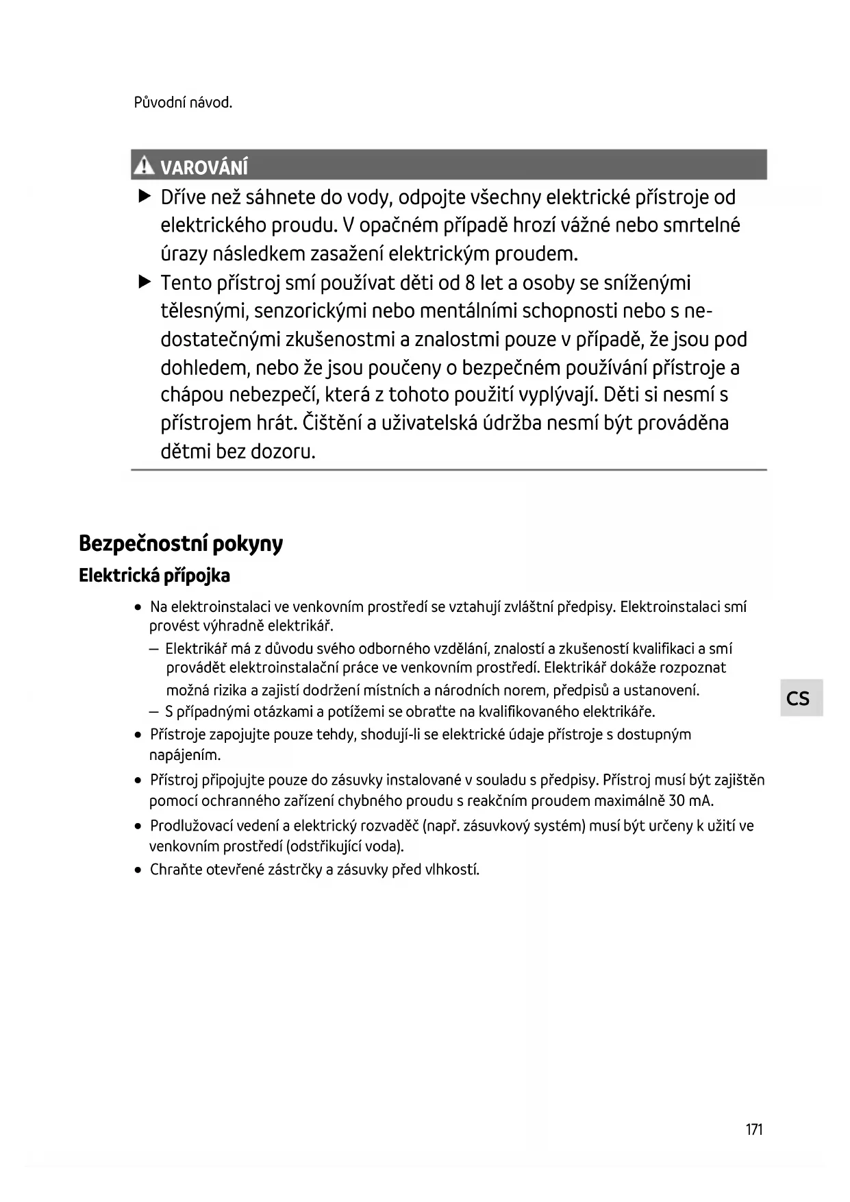VAROV ÁNÍ VAROVÁNÍ Dříve než sáhnete do vody, odpojte všechny elektrické přístroje od elektrického proudu. V opačném případě hrozí vážné nebo smrtelné úrazy následkem zasažení elektrickým proudem. Tento přístroj smí používat děti od 8 let a osoby se sníženými tělesnými, senzorickými nebo mentálními schopnosti nebo s ne- dostatečnými zkušenostmi a znalostmi pouze v případě, že jsou pod dohledem, nebo že jsou poučeny o bezpečném používání přístroje a chápou nebezpečí, která z tohoto použití vyplývají. Děti si nesmí s přístrojem hrát. Čištění a uživatelská údržba nesmí být prováděna dětmi bez dozoru.