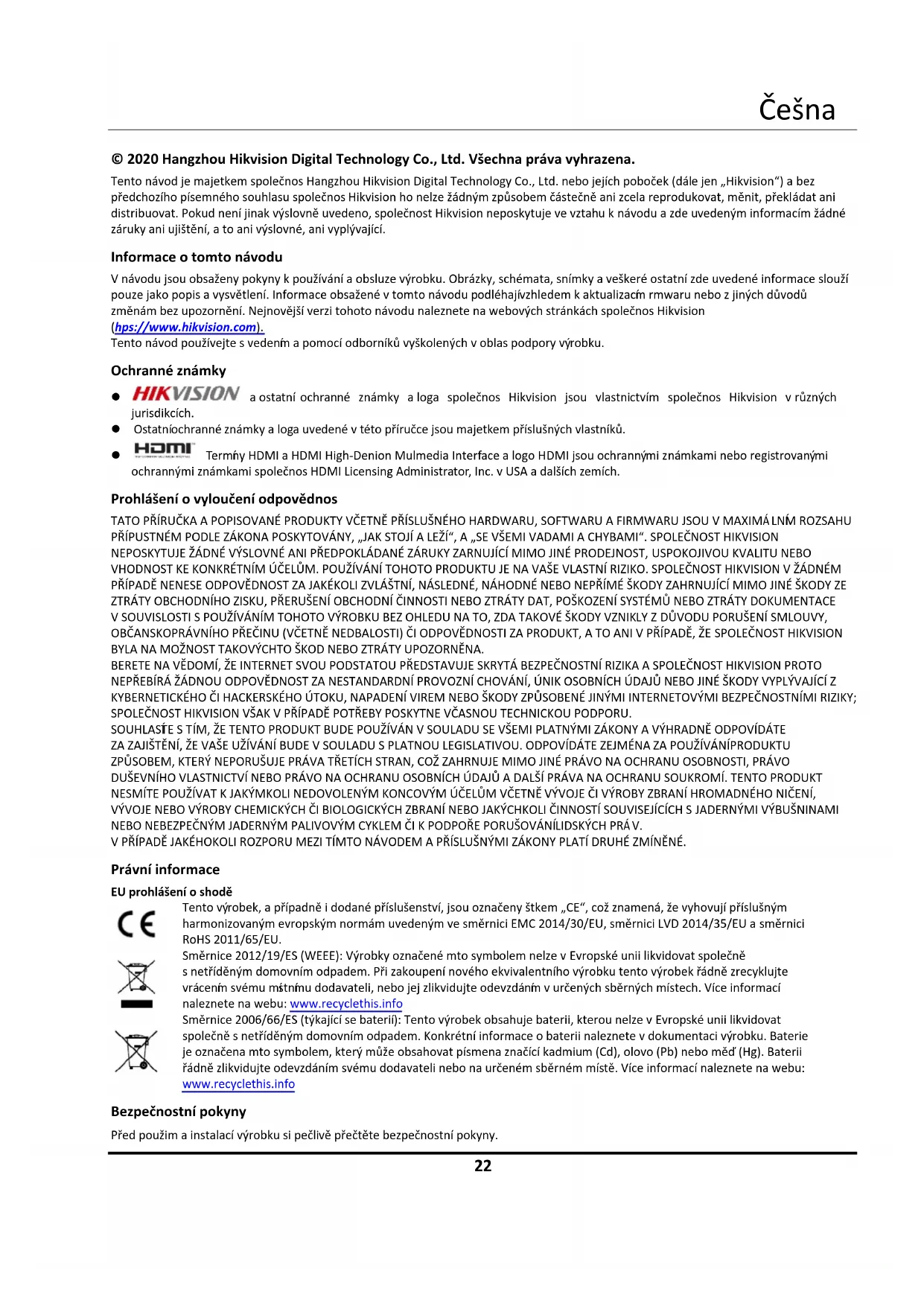 © 2020 Hangzhou Hikvision Digital Technology Co., Ltd. Všechna práva vyhrazena. Tento návod je majetkem společnosti Hangzhou Hikvision Digital Technology Co., Ltd. nebo jejích poboček (dále jen „Hikvision“) a bez předchozího písemného souhlasu společnosti Hikvision ho nelze žádným způsobem částečně ani zcela reprodukovat, měnit, překládat ani distribuovat. Pokud není jinak výslovně uvedeno, společnost Hikvision neposkytuje ve vztahu k návodu a zde uvedeným informacím žádné záruky ani ujištění, a to ani výslovné, ani vyplývající. Informace o tomto návodu V návodu jsou obsaženy pokyny k používání a obsluze výrobku. Obrázky, schémata, snímky a veškeré ostatní zde uvedené informace slouží pouze jako popis a vysvětlení. Informace obsažené v tomto návodu podléhají vzhledem k aktualizacím firmwaru nebo z jiných důvodů změnám bez upozornění. Nejnovější verzi tohoto návodu naleznete na webových stránkách společnosti Hikvision (https://www.hikvision.com). Tento návod používejte s vedením a pomocí odborníků vyškolených v oblasti podpory výrobku. Ochranné známky a ostatní ochranné známky a loga společnosti Hikvision jsou vlastnictvím společnosti Hikvision v různých jurisdikcích. Ostatní ochranné známky a loga uvedené v této příručce jsou majetkem příslušných vlastníků. Termíny HDMI a HDMI High-Definition Multimedia Interface a logo HDMI jsou ochrannými známkami nebo registrovanými ochrannými známkami společnosti HDMI Licensing Administrator, Inc. v USA a dalších zemích. Prohlášení o vyloučení odpovědnosti TATO PŘÍRUČKA A POPISOVANÉ PRODUKTY VČETNĚ PŘÍSLUŠNÉHO HARDWARU, SOFTWARU A FIRMWARU JSOU V MAXIMÁLNÍM ROZSAHU PŘÍPUSTNÉM PODLE ZÁKONA POSKYTOVÁNY, „JAK STOJÍ A LEŽÍ“, A „SE VŠEMI VADAMI A CHYBAMI“. SPOLEČNOST HIKVISION NEPOSKYTUJE ŽÁDNÉ VÝSLOVNÉ ANI PŘEDPOKLÁDANÉ ZÁRUKY ZARNUJÍCÍ MIMO JINÉ PRODEJNOST, USPOKOJIVOU KVALITU NEBO VHODNOST KE KONKRÉTNÍM ÚČELŮM. POUŽÍVÁNÍ TOHOTO PRODUKTU JE NA VAŠE VLASTNÍ RIZIKO. SPOLEČNOST HIKVISION V ŽÁDNÉM PŘÍPADĚ NENESE ODPOVĚDNOST ZA JAKÉKOLI ZVLÁŠTNÍ, NÁSLEDNÉ, NÁHODNÉ NEBO NEPŘÍMÉ ŠKODY ZAHRNUJÍCÍ MIMO JINÉ ŠKODY ZE ZTRÁTY OBCHODNÍHO ZISKU, PŘERUŠENÍ OBCHODNÍ ČINNOSTI NEBO ZTRÁTY DAT, POŠKOZENÍ SYSTÉMŮ NEBO ZTRÁTY DOKUMENTACE V SOUVISLOSTI S POUŽÍVÁNÍM TOHOTO VÝROBKU BEZ OHLEDU NA TO, ZDA TAKOVÉ ŠKODY VZNIKLY Z DŮVODU PORUŠENÍ SMLOUVY, OBČANSKOPRÁVNÍHO PŘEČINU (VČETNĚ NEDBALOSTI) ČI ODPOVĚDNOSTI ZA PRODUKT, A TO ANI V PŘÍPADĚ, ŽE SPOLEČNOST HIKVISION BYLA NA MOŽNOST TAKOVÝCHTO ŠKOD NEBO ZTRÁTY UPOZORNĚNA. BERETE NA VĚDOMÍ, ŽE INTERNET SVOU PODSTATOU PŘEDSTAVUJE SKRYTÁ BEZPEČNOSTNÍ RIZIKA A SPOLEČNOST HIKVISION PROTO NEPŘEBÍRÁ ŽÁDNOU ODPOVĚDNOST ZA NESTANDARDNÍ PROVOZNÍ CHOVÁNÍ, ÚNIK OSOBNÍCH ÚDAJŮ NEBO JINÉ ŠKODY VYPLÝVAJÍCÍ Z KYBERNETICKÉHO ČI HACKERSKÉHO ÚTOKU, NAPADENÍ VIREM NEBO ŠKODY ZPŮSOBENÉ JINÝMI INTERNETOVÝMI BEZPEČNOSTNÍMI RIZIKY; SPOLEČNOST HIKVISION VŠAK V PŘÍPADĚ POTŘEBY POSKYTNE VČASNOU TECHNICKOU PODPORU. SOUHLASÍTE S TÍM, ŽE TENTO PRODUKT BUDE POUŽÍVÁN V SOULADU SE VŠEMI PLATNÝMI ZÁKONY A VÝHRADNĚ ODPOVÍDÁTE ZA ZAJIŠTĚNÍ, ŽE VAŠE UŽÍVÁNÍ BUDE V SOULADU S PLATNOU LEGISLATIVOU. ODPOVÍDÁTE ZEJMÉNA ZA POUŽÍVÁNÍ PRODUKTU ZPŮSOBEM, KTERÝ NEPORUŠUJE PRÁVA TŘETÍCH STRAN, COŽ ZAHRNUJE MIMO JINÉ PRÁVO NA OCHRANU OSOBNOSTI, PRÁVO DUŠEVNÍHO VLASTNICTVÍ NEBO PRÁVO NA OCHRANU OSOBNÍCH ÚDAJŮ A DALŠÍ PRÁVA NA OCHRANU SOUKROMÍ. TENTO PRODUKT NESMÍTE POUŽÍVAT K JAKÝMKOLI NEDOVOLENÝM KONCOVÝM ÚČELŮM VČETNĚ VÝVOJE ČI VÝROBY ZBRANÍ HROMADNÉHO NIČENÍ, VÝVOJE NEBO VÝROBY CHEMICKÝCH ČI BIOLOGICKÝCH ZBRANÍ NEBO JAKÝCHKOLI ČINNOSTÍ SOUVISEJÍCÍCH S JADERNÝMI VÝBUŠNINAMI NEBO NEBEZPEČNÝM JADERNÝM PALIVOVÝM CYKLEM ČI K PODPOŘE PORUŠOVÁNÍ LIDSKÝCH PRÁV. V PŘÍPADĚ JAKÉHOKOLI ROZPORU MEZI TÍMTO NÁVODEM A PŘÍSLUŠNÝMI ZÁKONY PLATÍ DRUHÉ ZMÍNĚNÉ. Právní informace EU prohlášení o shodě