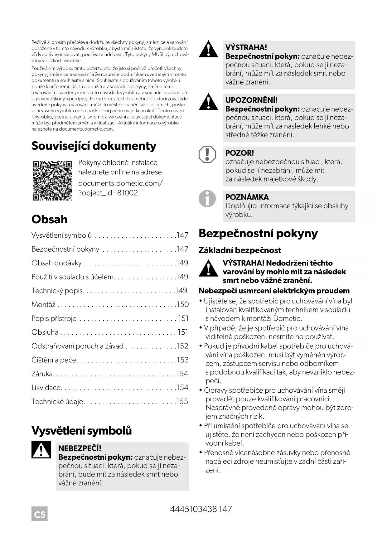 - Přenosné vícenásobné zásuvky nebo přenosné napájecí zdroje neumisťujte v zadní části zaří- zení. Pokyny ohledně instalace naleznete online na adrese documents.dometic.com/ ?object_id=81002 NEBEZPEČÍ! Bezpečnostní pokyn: označuje nebez- pečnou situaci, která, pokud se jí neza- brání, bude mít za následek smrt nebo vážné zranění. VÝSTRAHA! Bezpečnostní pokyn: označuje nebez- pečnou situaci, která, pokud se jí neza- brání, může mít za následek smrt nebo vážné zranění. UPOZORNĚNÍ! Bezpečnostní pokyn: označuje nebez- pečnou situaci, která, pokud se jí neza- brání, může mít za následek lehké nebo středně těžké zranění. POZOR! označuje nebezpečnou situaci, která, pokud se jí nezabrání, může mít za následek majetkové škody. POZNÁMKA Doplňující informace týkající se obsluhy výrobku.148 4445103438