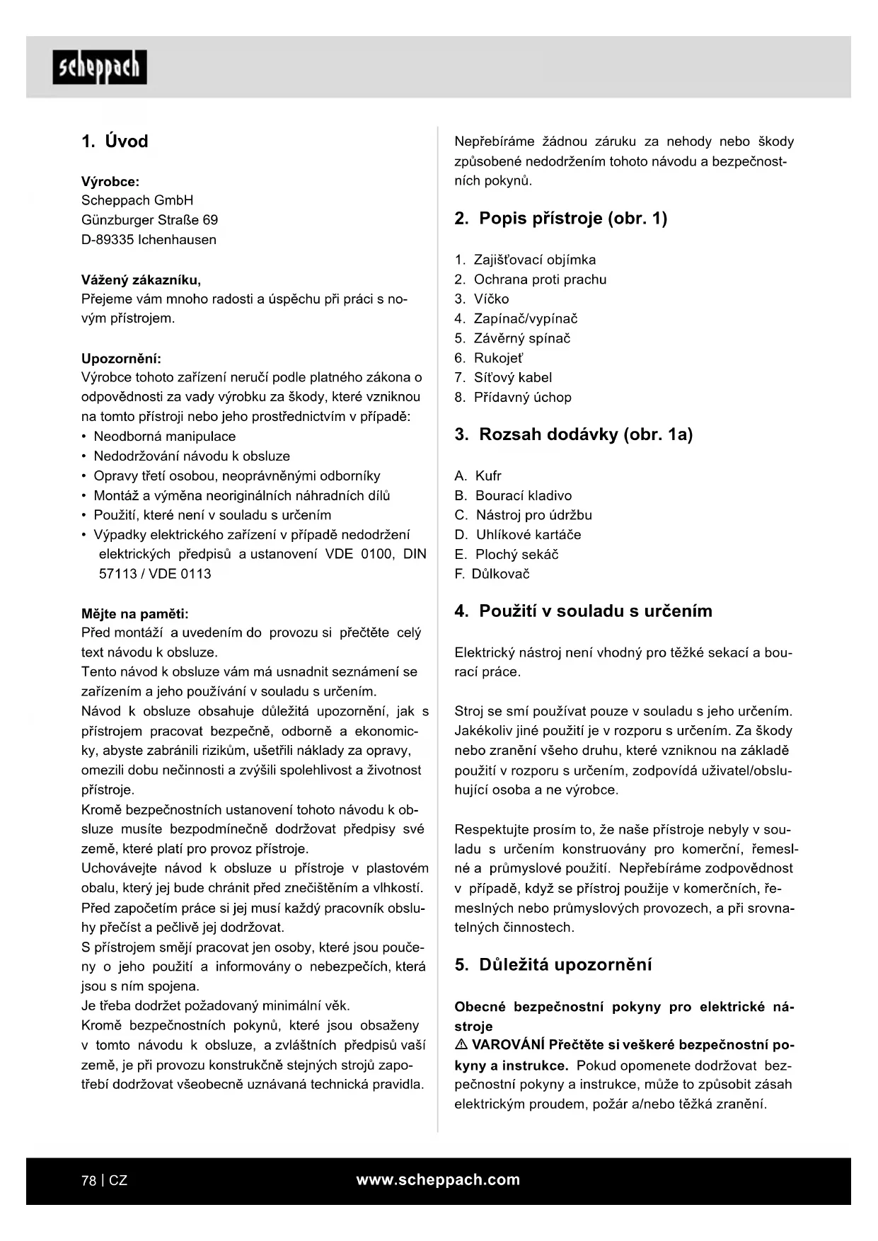 Výrobce: Scheppach GmbH Günzburger Straße 69 D-89335 Ichenhausen Vážený zákazníku, Přejeme vám mnoho radosti a úspěchu při práci s no- vým přístrojem. Upozornění: Výrobce tohoto zařízení neručí podle platného zákona o odpovědnosti za vady výrobku za škody, které vzniknou na tomto přístroji nebo jeho prostřednictvím v případě: