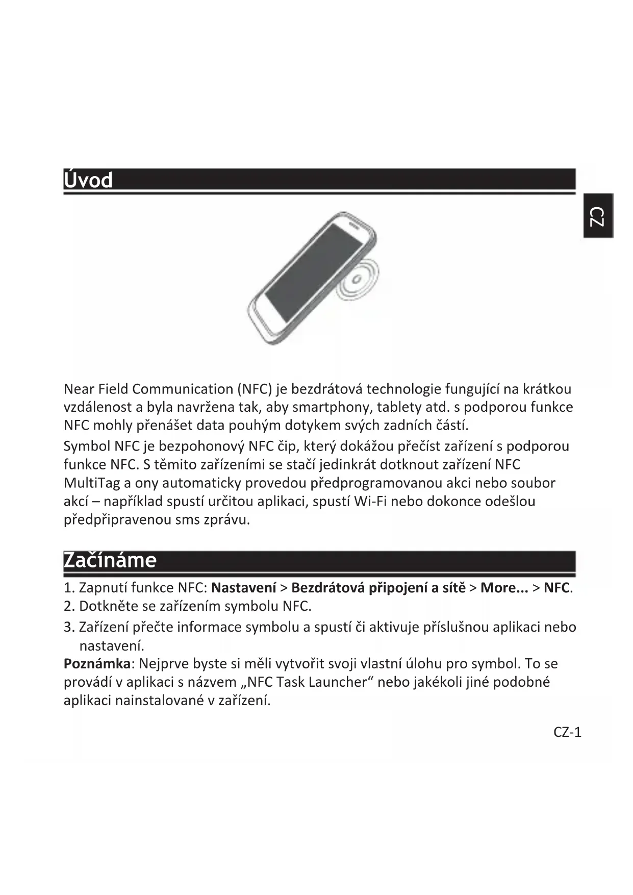 nastavení. Poznámka: Nejprve byste si měli vytvořit svoji vlastní úlohu pro symbol. To se provádí v aplikaci s názvem „NFC Task Launcher“ nebo jakékoli jiné podobné aplikaci nainstalované v zařízení.CZ-2