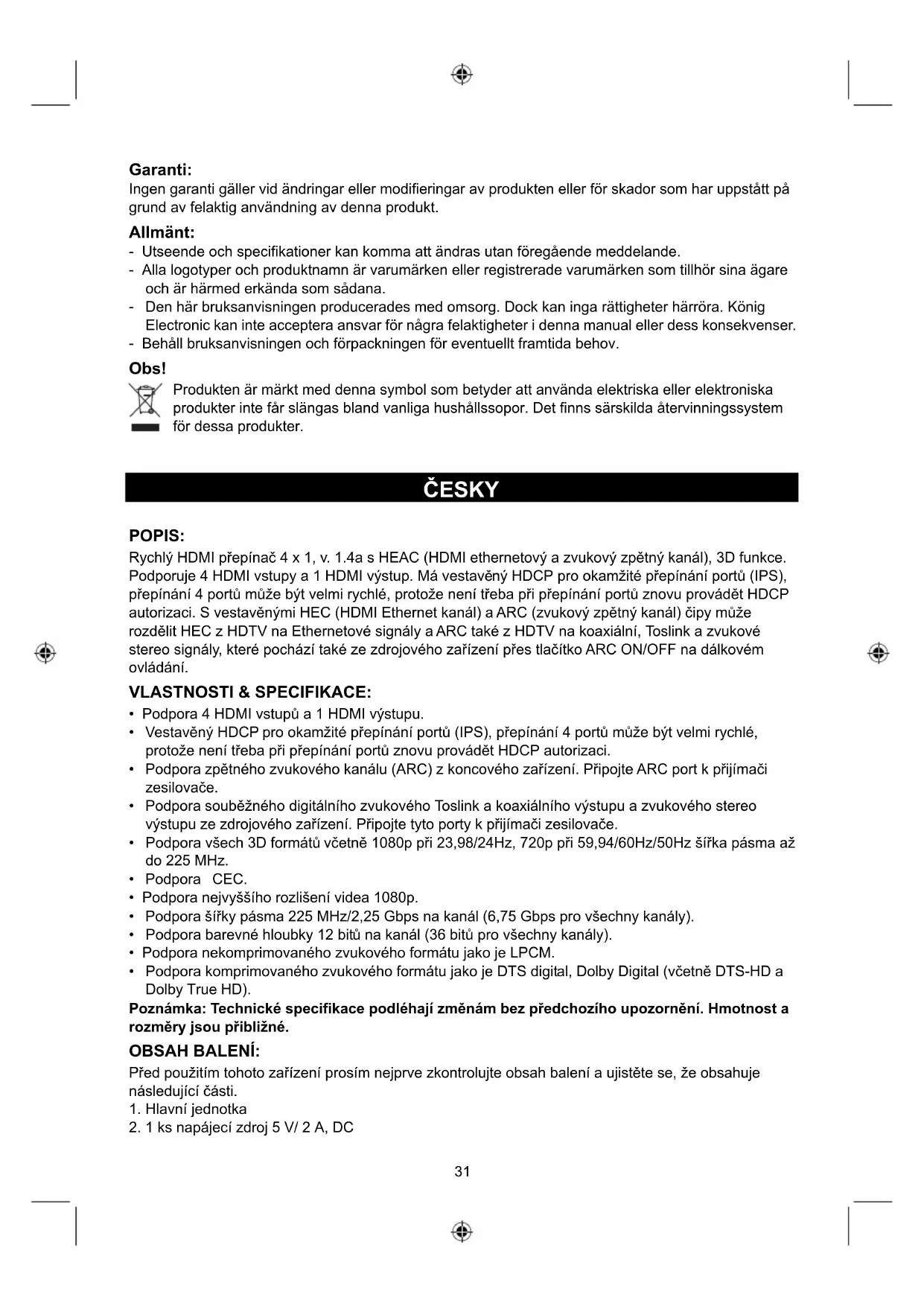 Přijímač zesilovače Blu-Ray DVD PS3 DVD Napájecí zdroj Ethernetový Zvukový kabel34 Bezpečnostní opatření: Abyste snížili riziko úrazu elektrickým šokem, měl by být tento výrobek otevřen POUZE autorizovaným technikem, je-li to nezbytné. V případě, že dojde k závadě, odpojte výrobek ze sítě a od jiných zařízení. Výrobek nevystavujte vodě nebo vlhkosti. Údržba: K čištění používejte pouze suchý hadřík. Nepoužívejte čisticí rozpouštědla ani abrazivní prostředky. Záruka: Jakékoli změny, modifikace nebo poškození zařízení v důsledku nesprávného zacházení se zařízením ruší platnost záruční smlouvy. Obecné upozornění: - Design a specifikace výrobku mohou být změněny bez předchozího upozornění. - Všechna loga a obchodní názvy jsou registrované obchodní značky příslušných vlastníků a jsou chráněny zákonem. - Tento manuál byl sestaven pečlivě. Avšak žádná práva nemohou být odvozena. König Electronic nemůže přijmout zodpovědnost za jakékoliv omyly v tomto manuálu ani za jejich důsledky. - Pro budoucí použití uschovejte tento návod a obal. Upozornění: Tento výrobek je označen tímto symbolem. To znamená, že se s výrobkem musí zacházet jako s nebezpečným elektrickým a elektronickým odpadem a nelze jej po skončení životnosti vyhazovat s běžným domácím odpadem. Pro likvidaci těchto výrobků existují zvláštní sběrná střediska.