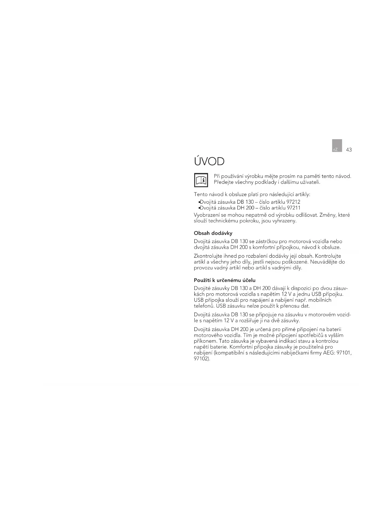 Dvojitá zásuvka DH 200 – číslo artiklu 97211 Vyobrazení se mohou nepatrně od výrobku odlišovat. Změny, které slouží technickému pokroku, jsou vyhrazeny. Obsah dodávky Dvojitá zásuvka DB 130 se zástrčkou pro motorová vozidla nebo dvojitá zásuvka DH 200 s komfortní přípojkou, návod k obsluze. Zkontrolujte ihned po rozbalení dodávky její obsah. Kontrolujte artikl a všechny jeho díly, jestli nejsou poškozené. Neuvádějte do provozu vadný artikl nebo artikl s vadnými díly. Použití k určenému účelu Dvojité zásuvky DB 130 a DH 200 dávají k dispozici po dvou zásuv- kách pro motorová vozidla s napětím 12 V a jednu USB přípojku. USB přípojka slouží pro napájení a nabíjení např. mobilních telefonů. USB zásuvku nelze použít k přenosu dat. Dvojitá zásuvka DB 130 se připojuje na zásuvku v motorovém vozid- le s napětím 12 V a rozšiřuje ji na dvě zásuvky. Dvojitá zásuvka DH 200 je určená pro přímé připojení na baterii motorového vozidla. Tím je možné připojení spotřebičů s vyšším příkonem. Tato zásuvka je vybavená indikací stavu a kontrolou napětí baterie. Komfortní přípojka zásuvky je použitelná pro nabíjení (kompatibilní s následujícími nabíječkami rmy AEG: 97101, 97102).4544 Každé jiné použití nebo pozměnění dvojité zásuvky platí jako použití k jinému než určenému účelu a může způsobit různá nebezpečí. Dvojitá zásuvka je určená jen k privátnímu použití. Dbejte na maximálně přípustný příkon připojených spotřebičů (viz. „Technické údaje“).