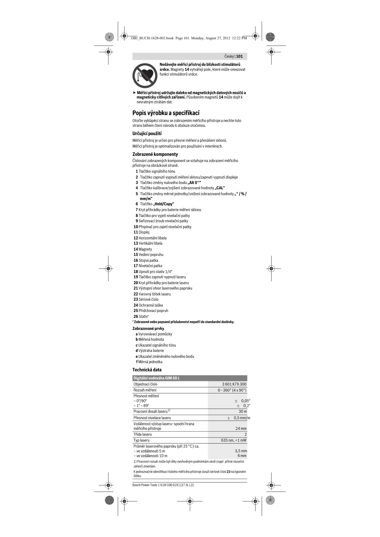 - Zobrazené nebo popsané příslušenství nepatří do standardní dodávky. Zobrazované prvky a Vyrovnávací pomůcky b Měřená hodnota c Ukazatel signálního tónu d Výstraha baterie e Ukazatel změněného nulového bodu f Měrná jednotka Technická data Digitální vodováha GIM 60 L Objednací číslo 3 601 K76 300 Rozsah měření 0–360° (4 x 90°) Přesnost měření – 0°/90° – 1°–89° ± 0,05° ± 0,2° Pracovní dosah laseru