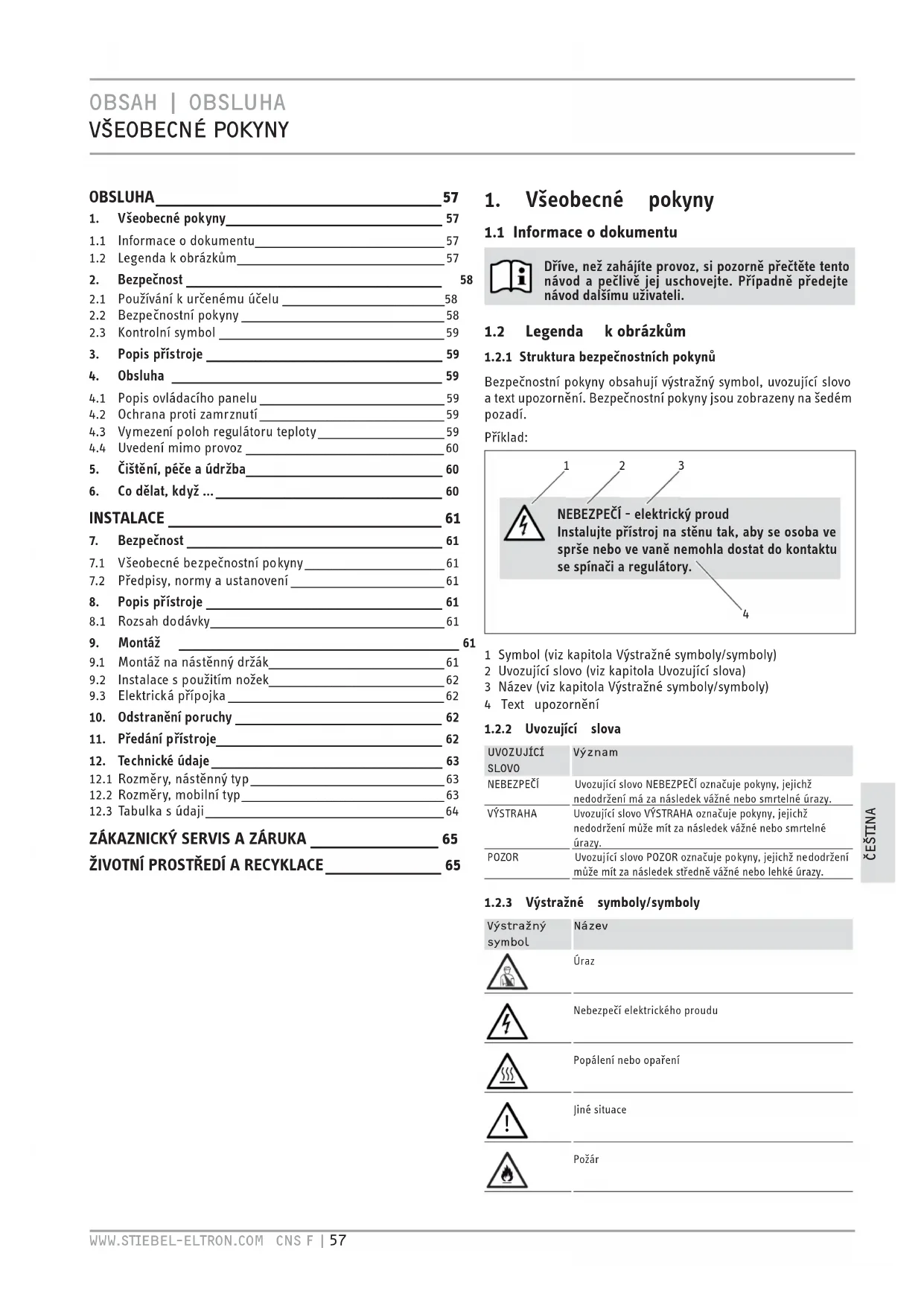 1.2.1 Struktura bezpečnostních pokynůBezpečnostní pokyny obsahují výstražný symbol, uvozující slovo a text upozornění. Bezpečnostní pokyny jsou zobrazeny na šedém pozadí.Příklad: NEBEZPEČÍ - elektrický proudInstalujte přístroj na stěnu tak, aby se osoba ve sprše nebo ve vaně nemohla dostat do kontaktu se spínači a regulátory.