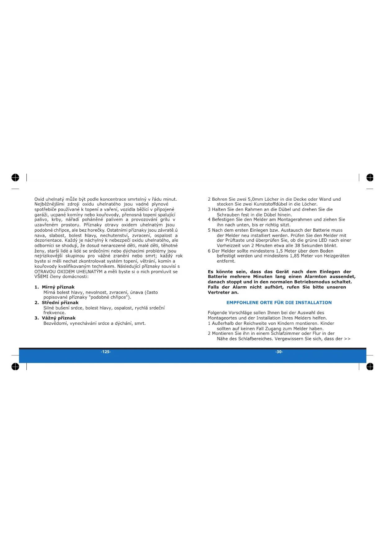 8 Nedávejte na místa s vířivých vzduchem od stropních ventilátorů. 9 Nedávejte do průvanu nebo blízkosti dveří a oken, která se otevírají ven. 10 Udržujte alarm mimo místa s nadměrnou prašností, znečištěním nebo mastnotou, jako jsou např kuchyně, garáže a kotelny. Prach,mastnota domácí chemik mohou negativně ovlivnit čidlo. 11 Udržujte mimo vlhké a mokré oblasti jako např. koupelny. Vyhněte se stříkání aerosolů v blízkosti alarmu. 12 Neinstalujte na místa, kde teplota klesá pod 4°C nebo stoupá nad 38°C. 13 Nedávejte za záclony nebo nábytek. Oxid uhelnatý musí být schopen dostat se do čidla, aby alarm přesně detekoval oxid uhelnatý. Kontrolka předehřátí během připojení zdroje energie: červená TEST/ALARM LED kontrolka bude blikat jednou za 6 sekund a toto bude trvat 2 minuty, když je zapojen zdroj energie alarmu. CO nebude během předehřívání detekován. Normální indikace: Jestliže alarm funguje normálně, zelená napájecí LED kontrolka bude blikat jednou za 38 sekund. Indikace ALARMU: Je-li detekována nebezpečná hladina oxidu uhelnatého, alarm zazní 4krát a odpovídající červená TEST/ALARM LED kontrolka bude blikat 4krát za 5 sekund, dokud oxid uhelnatý nebude eliminován. Indikace poruchy baterie: Je-li detekována porucha nebo vybití baterie, alarm jednou krátce zapípá a odpovídající žlutá LED kontrolka poruchy bude blikat jednou za 38 sekund. LED KONTROLKA-37- 4 Vermeiden Sie es, in der Nähe des Melders Luftauffrischer, Haarspray oder anderes zu versprühen. 5 Streichen Sie das Gerät nicht an. Durch die Farbe werden die Öffnungen verklebt und die Fähigkeit des Sensors, Kohlenmonoxid zu erfassen, wird gestört. Versuchen Sie niemals, das Gerät auseinanderzubauen oder innen zu reinigen. Dadurch wird Ihre Garantie ungültig. 6 Hängen Sie den Melder so bald wie möglich wieder zurück an seinen Ort, um den Schutz vor Kohlenmonoxid weiterhin zu gewährleisten. 7 Nach Gebrauch von Haushaltsreinigern oder anderen Schadstoffen sollte der Raum gelüftet werden. Warnung: Folgende Substanzen können den Sensor beeinträchtigen und zu falschen Messungen führen: Methan, Propan, Isobutan, Isopropanol, Ethylen, Benzol, Toluol, Ethylazetat, Schwefelwasserstoff, Schwefeldioxid, Produkte auf Alkoholbasis, Farbe, Verdünner, Lösungsmittel, Klebstoffe, Haarsprays, Aftershaves, Parfum und einige Reinigungsmittel. Warnung: Ohne Batterie funktioniert Ihr Kohlenmonoxidmelder nicht und kann den Kohlenmonoxidgehalt nicht messen. Warnung: Es ist gefährlich, den Melder zu manipulieren. Warnung: Der Melder kann die chronischen Effekte einer Belastung durch Kohlenmonoxid nicht verhindern. Warnung: Dieser Melder schützt Einzelne nicht vor einem spezifischen Risiko. Warnung: Dieses Gerät ist dazu gemacht, um Einzelne vor den akuten Effekten der Belastung durch Kohlenmonoxid zu schützen.