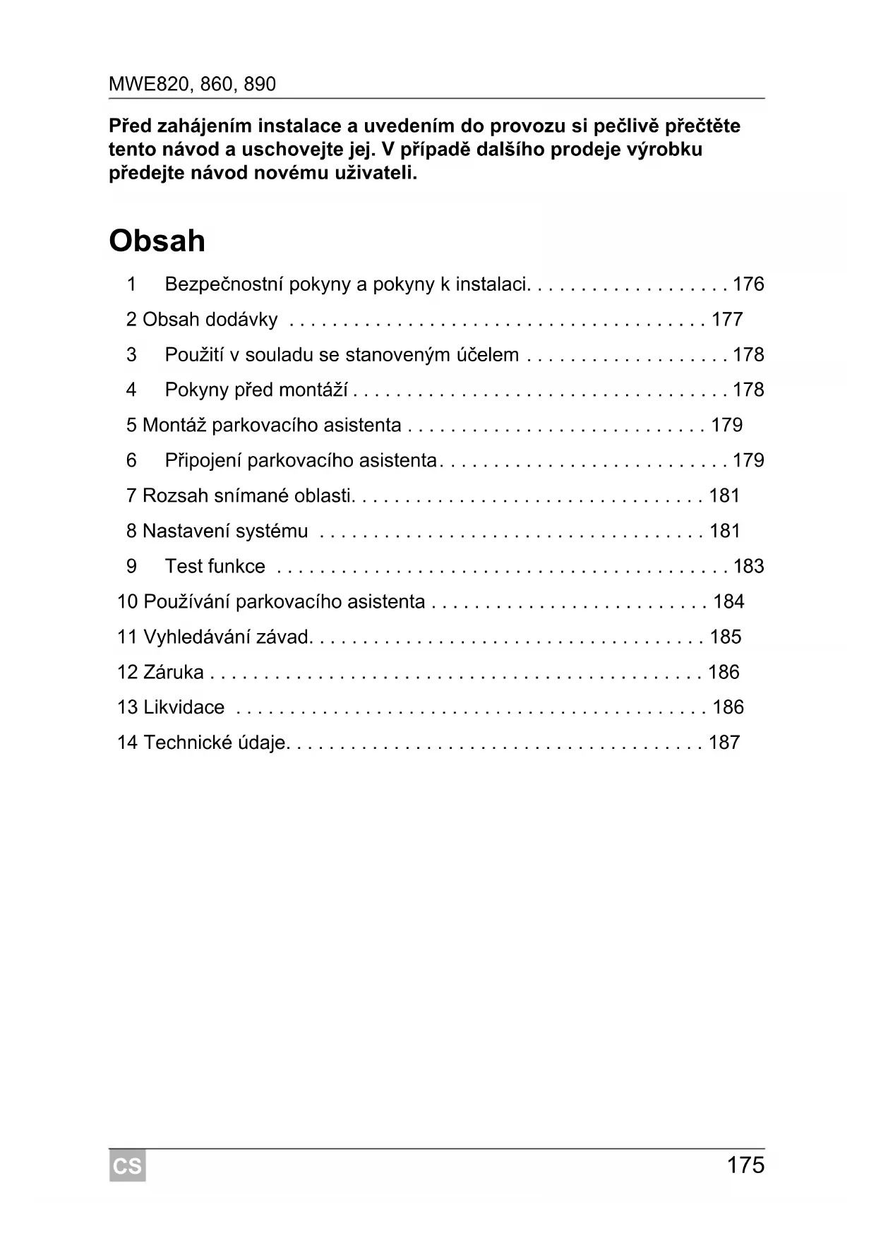 POZOR! Okamžitě zastavte vozidlo a zkontrolujte situaci (případně i vy- stupte), pokud se při manévrování stane následující: Při manévrování přístroj nejprve signalizoval překážku a sled akustických signálů se obvyklým způsobem měnil (např. změna z pomalejšího sledu akustických signálů na rychlejší). Náhle se změnil sled akustických signálů na pomalejší nebo systém zcela přestal indikovat překážku. To znamená, že původní překážka již není v oblasti snímané sní- mači (závisí na typu instalace), ale stále ještě je možné do ní na- razit. POZOR! Systém nefunguje spolehlivě, pokud jsou jeden nebo několik sní- mačů poškozené.CS Záruka MWE820, 860, 890