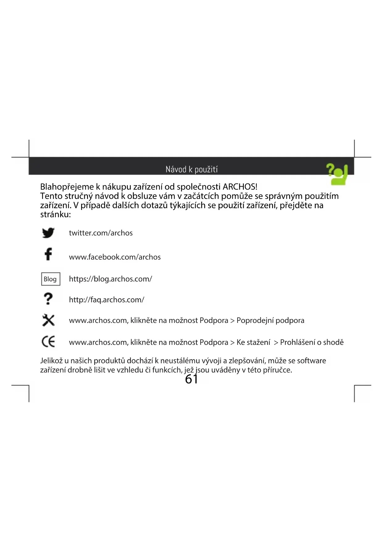 Soukromé sítě se zobrazují s ikonou zámku a budou od vás vyžadovat zadání hesla. Začínáme66 Mé zařízení zamrzlo: stiskněte tlačítko ON/OFF na déle než deset sekund nebo vyjměte a znovu vložte baterii poté zapněte zařízení. Mé zařízení nefunguje správně: Jděte do Nastavení > o telefonu > Zkontrolujte aktualizace pro případný update systému. Je-li verze Vašeho zařízení aktuální, zkuste jej resetovat cestou Nastavení > Obnovení továrních nastavení > Záloha a obnovení. Doporučujeme před tímto krokem zálohovat veškerá data. Pokud je příjem signálu Wi-Fi příliš slabý: Ujistěte se, že se nenacházíte příliš daleko od Wi-Fi hotspotu. Aktualizujte rmware zařízení: http://www.archos.com/support. Resetujte a znovu denujte parametry připojení. Kontaktujte svého poskytovatele Wi-Fi připojení Startovací logo zařízení se přehrává pořád dokola: musíte zcela restartovat zařízení. Navštivte stránku faq.archos.com a zvolte své zařízení. V menu Záloha a obnovení zvolte Jak znovu spustit můj ARCHOS Pokud budete potřebovat další odpovědi týkající se technických problémů, navštivte naši stránku: faq.archos.com Odstraňování problémů67 Pomoc a podpora Blahoželáme vám ku kúpe zariadenia značky ARCHOS! Tento krátky návod vám poradí, ako používať vaše zariadenie správnym spôsobom. Ak máte viac otázok k používaniu zariadenia, navštívte nás na nasledujúcich adresách: twitter.com/archos www.facebook.com/archos Blog https://blog.archos.com/ http://faq.archos.com/ www.archos.com, kliknite na položku Podpora > Popredajná podpora www.archos.com, kliknite na položku Podpora > Súbory na prevzatie > Prehlásenie o zhode Keďže naše zariadenia sa často aktualizujú a vylepšujú, softvér vo vašom zariadení môže mať v porovnaní s týmto krátkym návodom mierne odlišný vzhľad alebo upravené funkcie.68 Warranty Obsah balenia ARCHOS 50F Neon Krátky návod Záručné, právne a bezpečnostné upozornenia USB kábel Nabíjačka69 Popis zariadenia Predná kamera Reproduktor Konektor na pripojenie slúchadiel Zadná kamera Blesk Vypínač Nastavenie hlasitosti Reproduktor Micro USB port Svetelný senzor Mikrofón70 Picture to show how to remove the bottom casing Remove the battery Picture to show the scards position