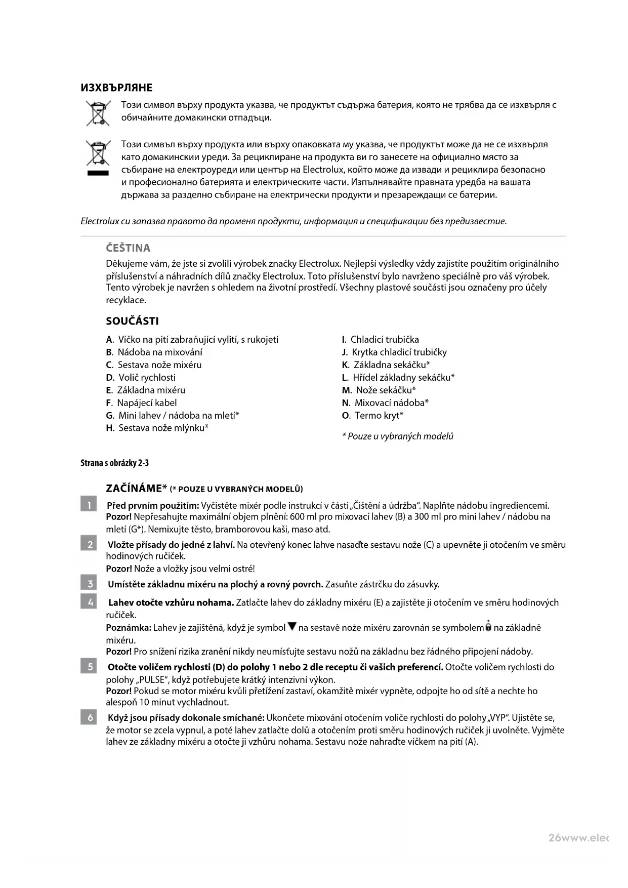 - Pouze u vybraných modelů Strana s obrázky 2-3 ZAČÍNÁME* * POUZE U VYBRANÝCH MODELŮ 1 Před prvním použitím: Vyčistěte mixér podle instrukcí včásti „Čištění aúdržba“. Naplňte nádobu ingrediencemi. Pozor! Nepřesahujte maximální objem plnění: 600 ml pro mixovací lahev (B) a 300 ml pro mini lahev / nádobu na mletí (G*). Nemixujte těsto, bramborovou kaši, maso atd. 2 Vložte přísady do jedné z lahví. Na otevřený konec lahve nasaďte sestavu nože (C) a upevněte ji otočením ve směru hodinových ručiček. Pozor! Nože a vložky jsou velmi ostré! 3 Umístěte základnu mixéru na plochý arovný povrch. Zasuňte zástrčku do zásuvky. 4 Lahev otočte vzhůru nohama. Zatlačte lahev do základny mixéru (E) a zajistěte ji otočením ve směru hodinových ručiček. Poznámka: Lahev je zajištěná, když je symbol na sestavě nože mixéru zarovnán se symbolem na základně mixéru. Pozor! Pro snížení rizika zranění nikdy neumísťujte sestavu nožů na základnu bez řádného připojení nádoby. 5 Otočte voličem rychlosti (D) do polohy 1 nebo 2 dle receptu či vašich preferencí. Otočte voličem rychlosti do polohy „PULSE“, když potřebujete krátký intenzivní výkon. Pozor! Pokud se motor mixéru kvůli přetížení zastaví, okamžitě mixér vypněte, odpojte ho od sítě anechte ho alespoň 10minut vychladnout. 6 Když jsou přísady dokonale smíchané: Ukončete mixování otočením voliče rychlosti do polohy „VYP“. Ujistěte se, že motor se zcela vypnul, a poté lahev zatlačte dolů a otočením proti směru hodinových ručiček ji uvolněte. Vyjměte lahev ze základny mixéru a otočte ji vzhůru nohama. Sestavu nože nahraďte víčkem na pití (A).27www.electrolux.com