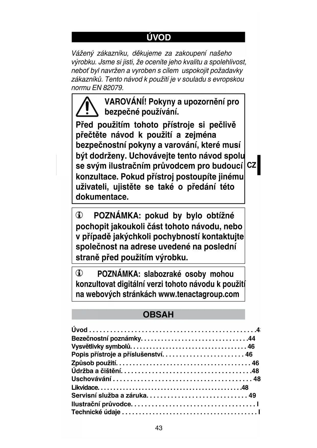 POZNÁMKA: pokud by bylo obtížné pochopit jakoukoli část tohoto návodu, nebo v případě jakýchkoli pochybností kontaktujte společnost na adrese uvedené na poslední straně před použitím výrobku. POZNÁMKA: slabozraké osoby mohou konzultovat digitální verzi tohoto návodu k použití na webových stránkách www.tenactagroup.com OBSAH Úvod . . . . . . . . . . . . . . . . . . . . . . . . . . . . . . . . . . . . . . . . . . . . . . . .43 Bezečnostní poznámky. . . . . . . . . . . . . . . . . . . . . . . . . . . . . . . .44 Vysvětlivky symbolů. . . . . . . . . . . . . . . . . . . . . . . . . . . . . . . . . . . . 46 Popis přístroje a příslušenství. . . . . . . . . . . . . . . . . . . . . . . . 46 Způsob použití. . . . . . . . . . . . . . . . . . . . . . . . . . . . . . . . . . . . . . . . 46 Údržba a čištění. . . . . . . . . . . . . . . . . . . . . . . . . . . . . . . . . . . . . .48 Uschovávání . . . . . . . . . . . . . . . . . . . . . . . . . . . . . . . . . . . . . . . . 48 Likvidace. . . . . . . . . . . . . . . . . . . . . . . . . . . . . . . . . . . . . . . . . . . . . .48 Servisní služba a záruka. . . . . . . . . . . . . . . . . . . . . . . . . . . . . 49 Ilustrační průvodce. . . . . . . . . . . . . . . . . . . . . . . . . . . . . . . . . . . . I Technické údaje . . . . . . . . . . . . . . . . . . . . . . . . . . . . . . . . . . . . . . . . I44