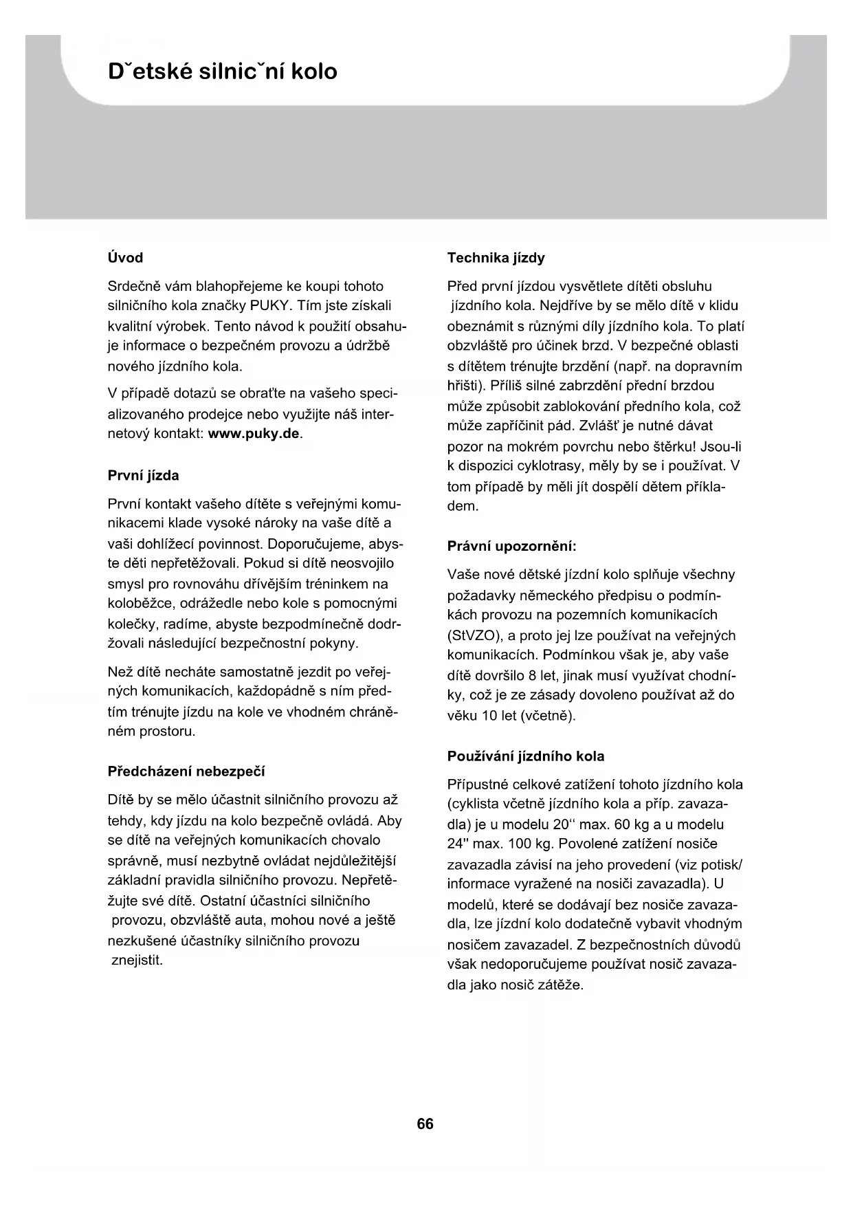Srdečně vám blahopřejeme ke koupi tohoto silničního kola značky PUKY. Tím jste získali kvalitní výrobek. Tento návod k použití obsahuje informace o bezpečném provozu a údržbě nového jízdního kola.